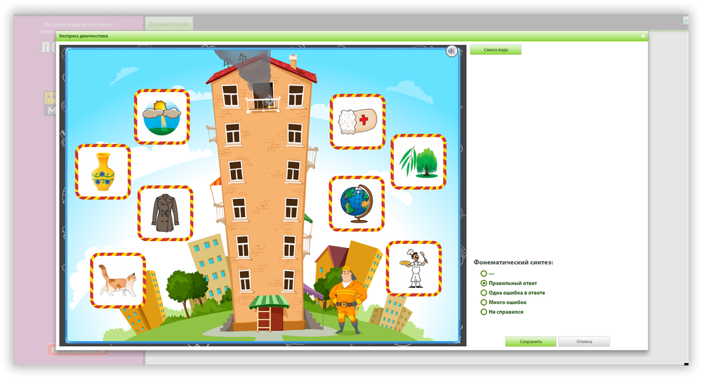 Программа состоит из трёх блоков, с помощью которых можно провести обследования. Первый блок - речевая карта. С помощью этой функции можно исследовать уровень письменной речи чтения у ребёнка, а после вывести результат. Второй блок - диаграмма. С помощью этой функции вы можете вывести результаты для наглядного отображения. Видеть карту обследования полностью (проблемные места ребёнка) и продемонстрировать её родителям или другим специалистам. Третий блок - звуковой журнал. Эта функция позволит делать звуковые записи голоса ребёнка, проводить анализ звукопроизношения и вести список всех аудиозаписей.