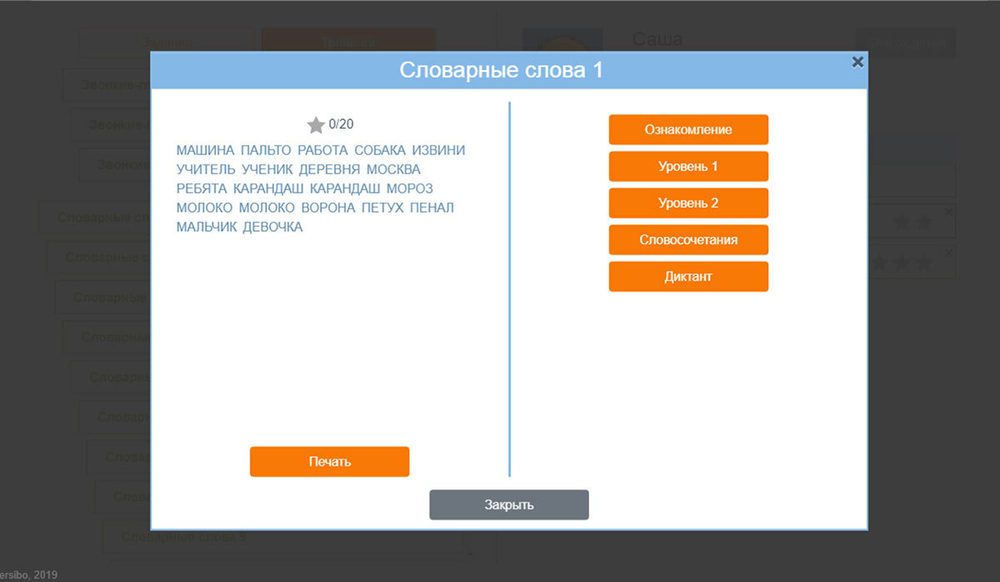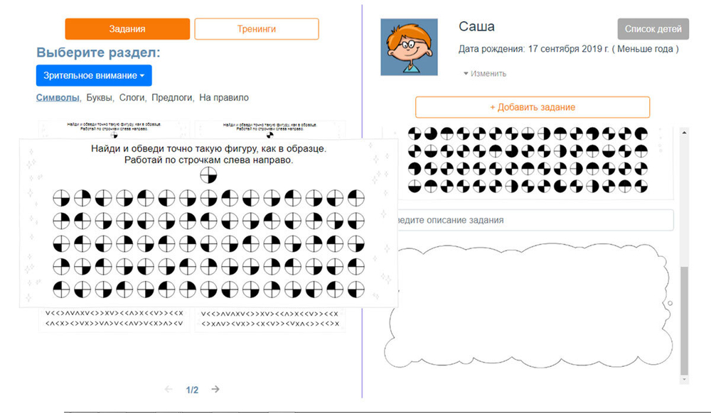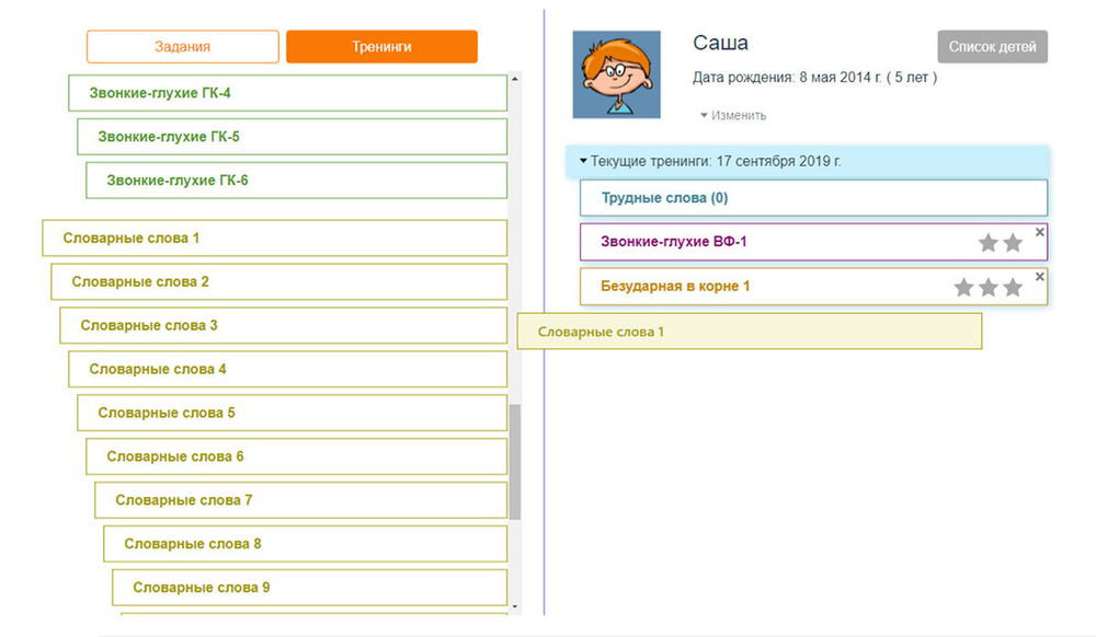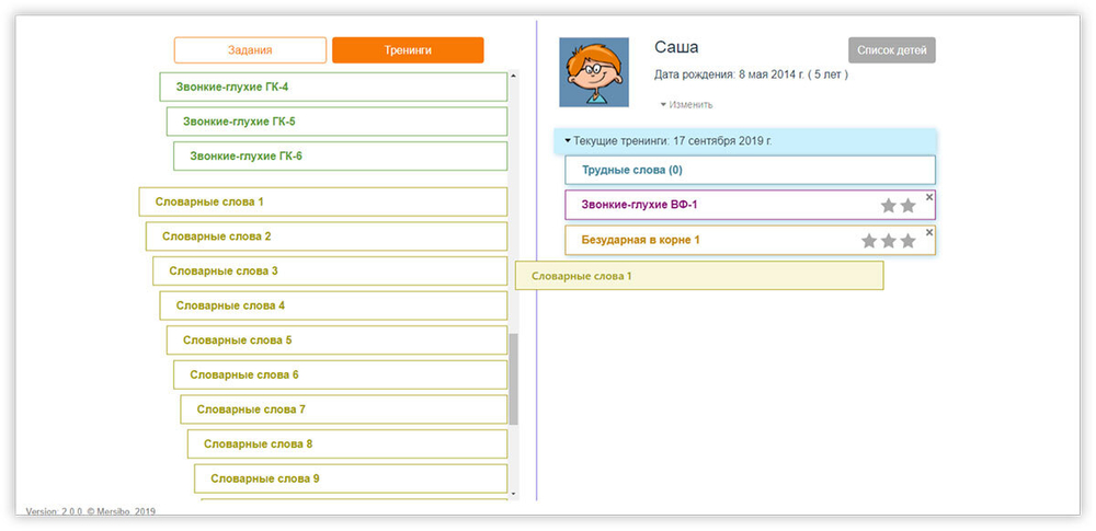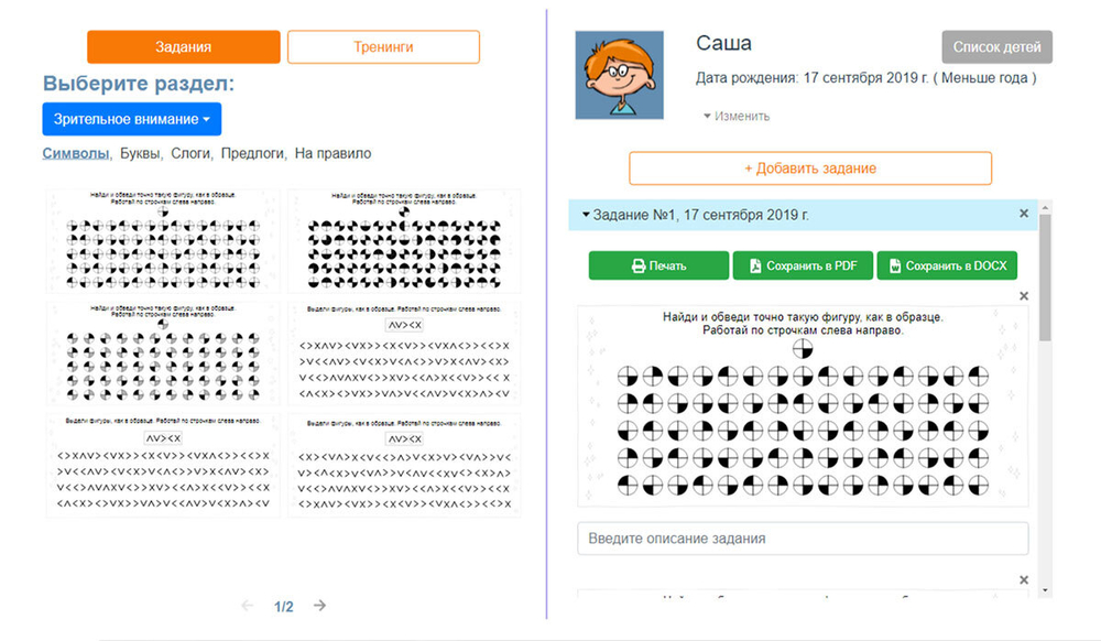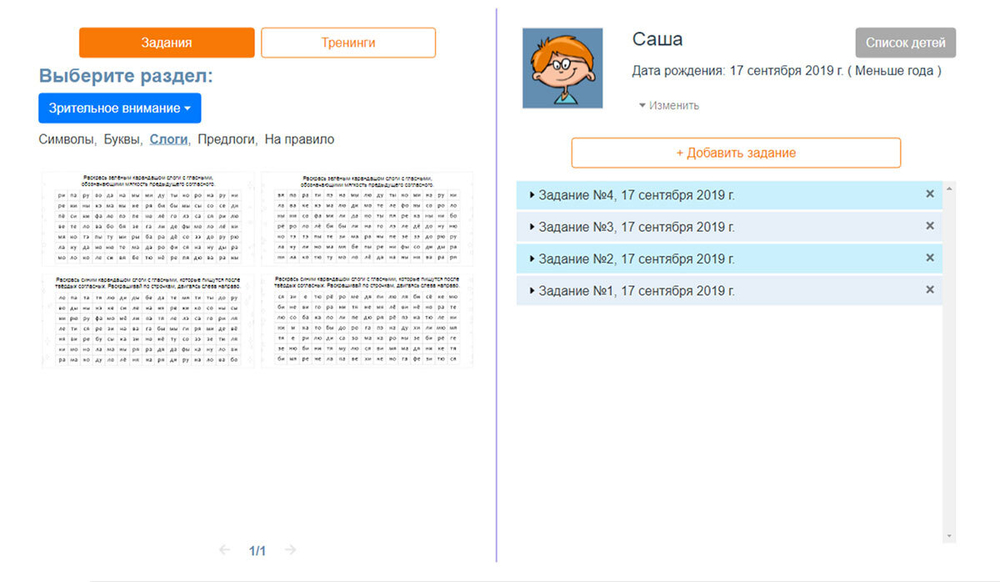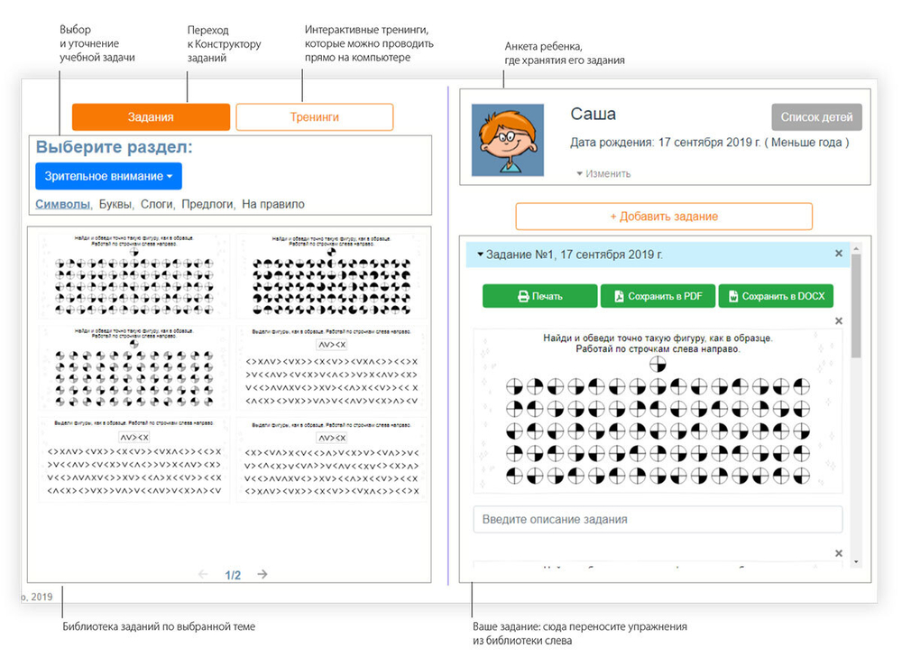 В программе два раздела: конструктор заданий и интерактивные тренинги. В конструкторе заданий вы формируете набор упражнений. Сохраненное задание можно распечатать и провести обычное занятие или провести интерактивный тренинг прямо в программе.