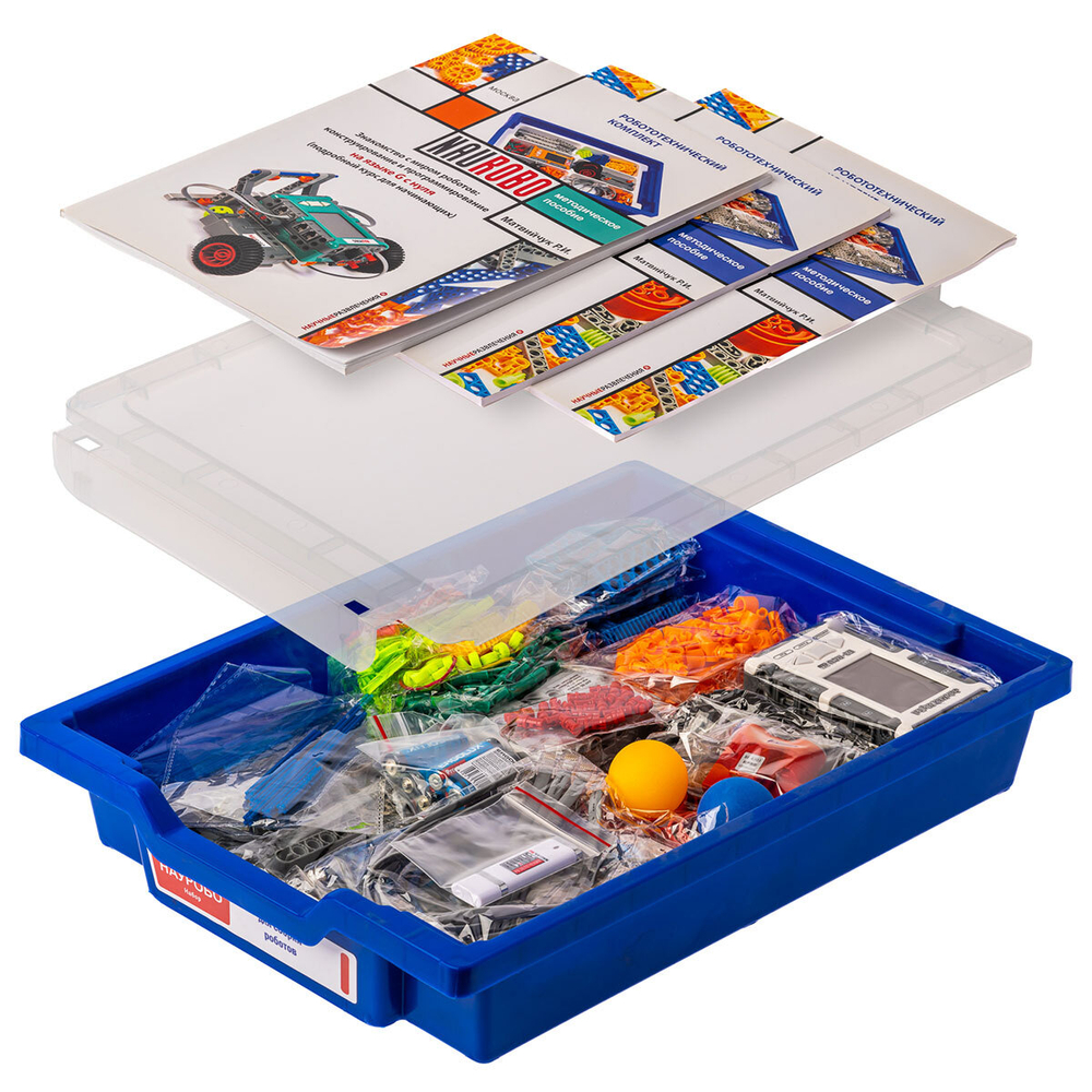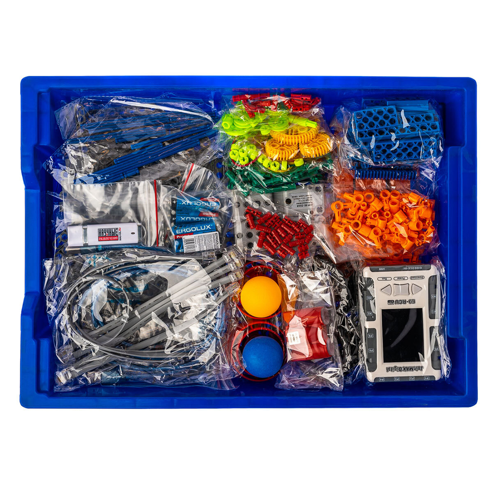 Состав: – Контроллер – Монтажное поле – Комплект соединительных проводов – Датчик света (2 шт.) – Датчик касания (2 шт.) – Светодиод (3 шт.) – Датчик расстояния (дальномер) – Комплект двигателей – Конструкторский робототехнический набор – Программное обеспечение для работы с контроллером и набором