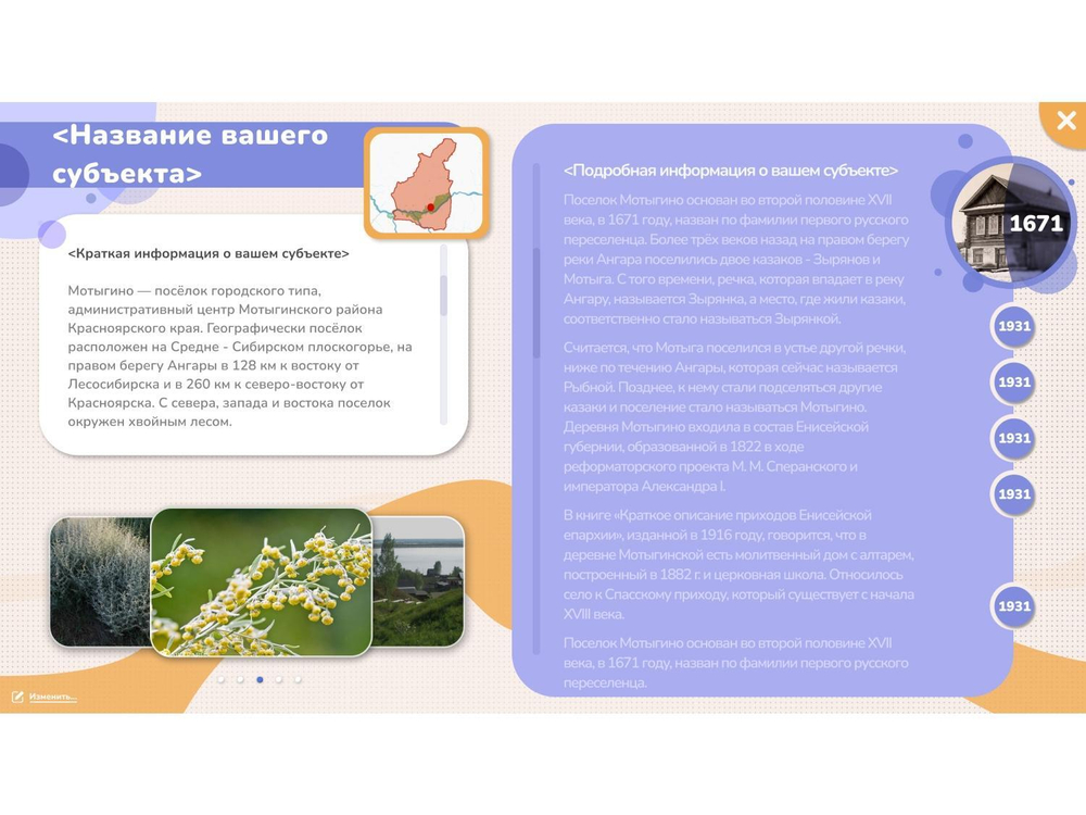 На примере представлено: программное обеспечение краеведческой тематики, посвящённое изучению Мотыгинского района Красноярского края РФ. ПО включает интерактивную карту, на которой отмечены населённые пункты, а также информацию про географию, историю, животный и растительный мир, почётных жителей и достопримечательности района.  Программное обеспечение станет отличным дополнением к урокам краеведения и обществоведения в школе или музее, внося современные цифровые технологии в образовательный процесс.