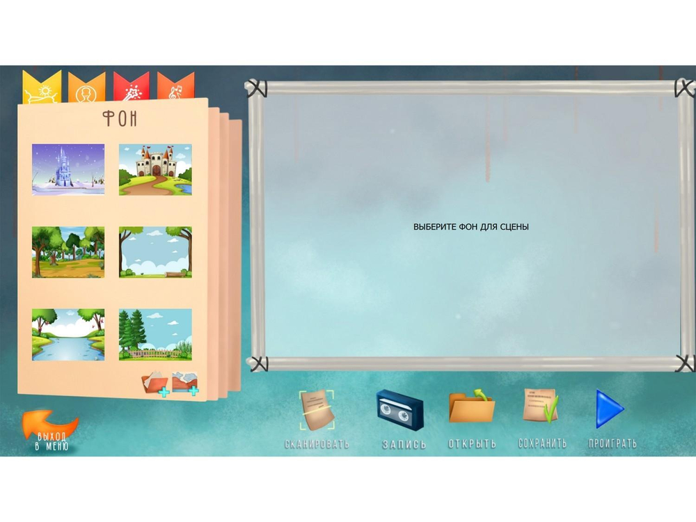 Ребёнок может сам рисовать героев, писать про них истории и создавать антураж. А может воспользоваться набором фонов и персонажей, идущим в комплекте.