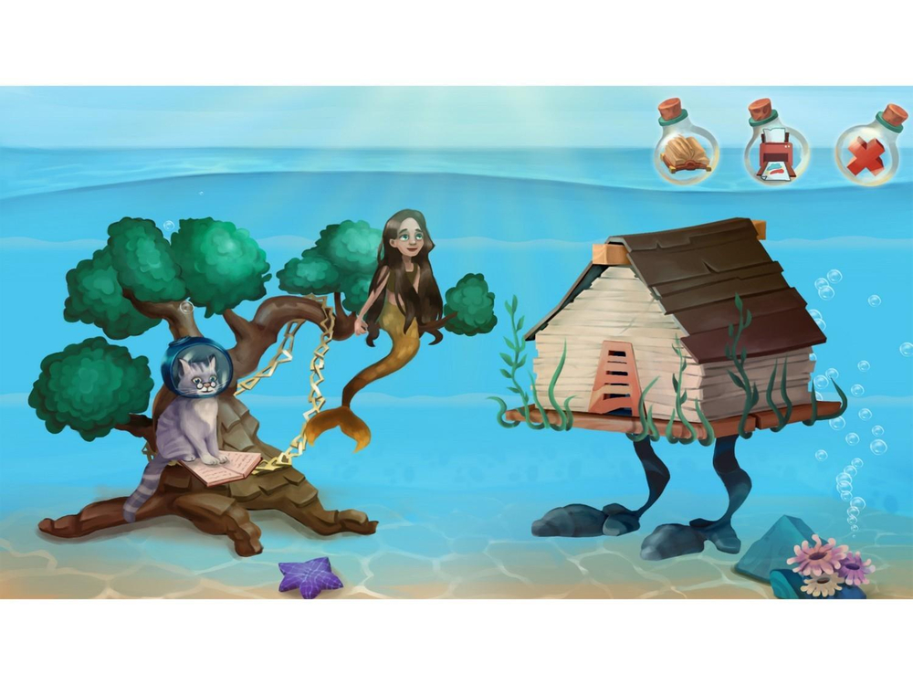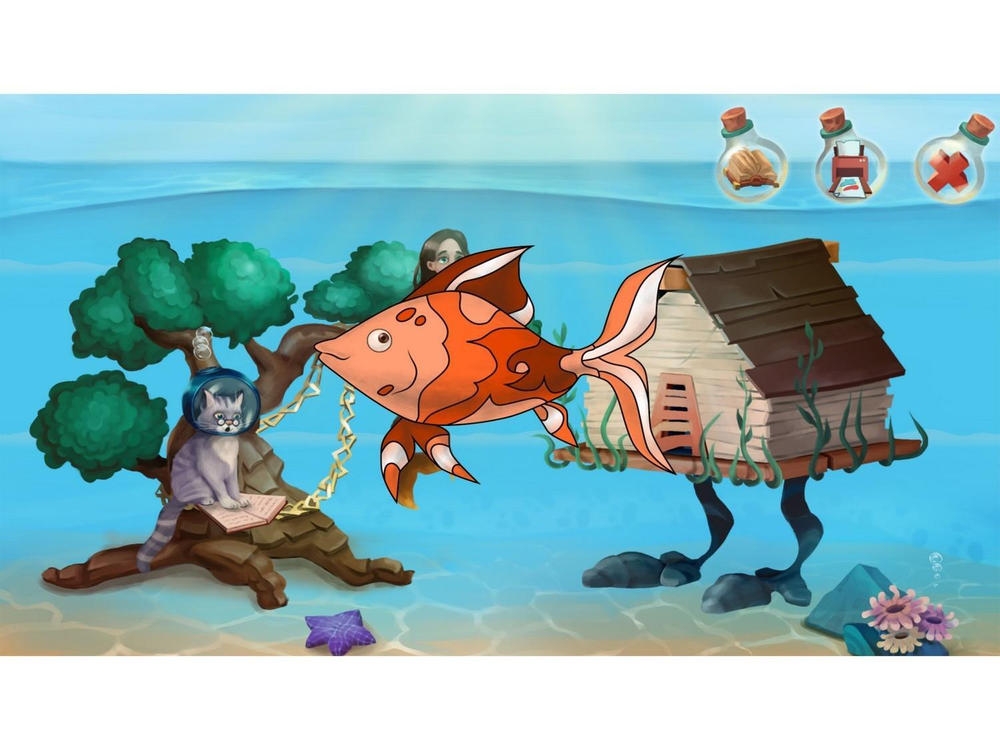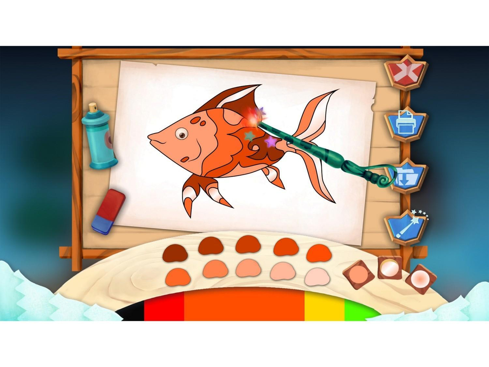 1) Интерактивное морское дно, которое населяют анимационные герои сказок А. С. Пушкина: русалка, избушка на курьих ножках, ученый кот, богатыри. Эти персонажи двигаются, а среди них плавают рыбки, раскрашенные детьми.