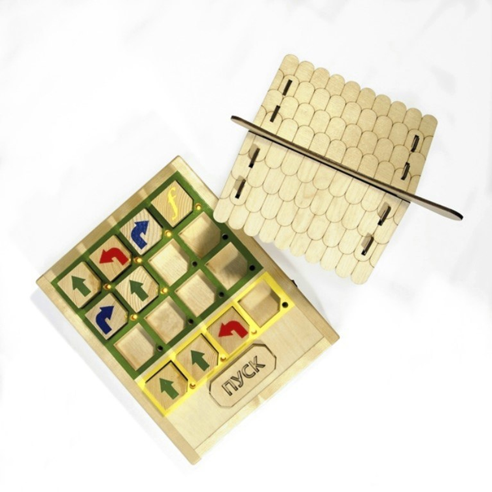 3. Необходимое количество кубиков поможет ребенку построить программу движения Повозки. Кубики также изготовлены из дерева. Скошенное ребро позволяет устанавливать их только в одном положении. Сделано это для того, чтобы не перепутать направления, в частности влево и вправо, движения Повозки. Стрелки направлений окрашены в разные цвета: красный, синий и зеленый. Функция – желтый.