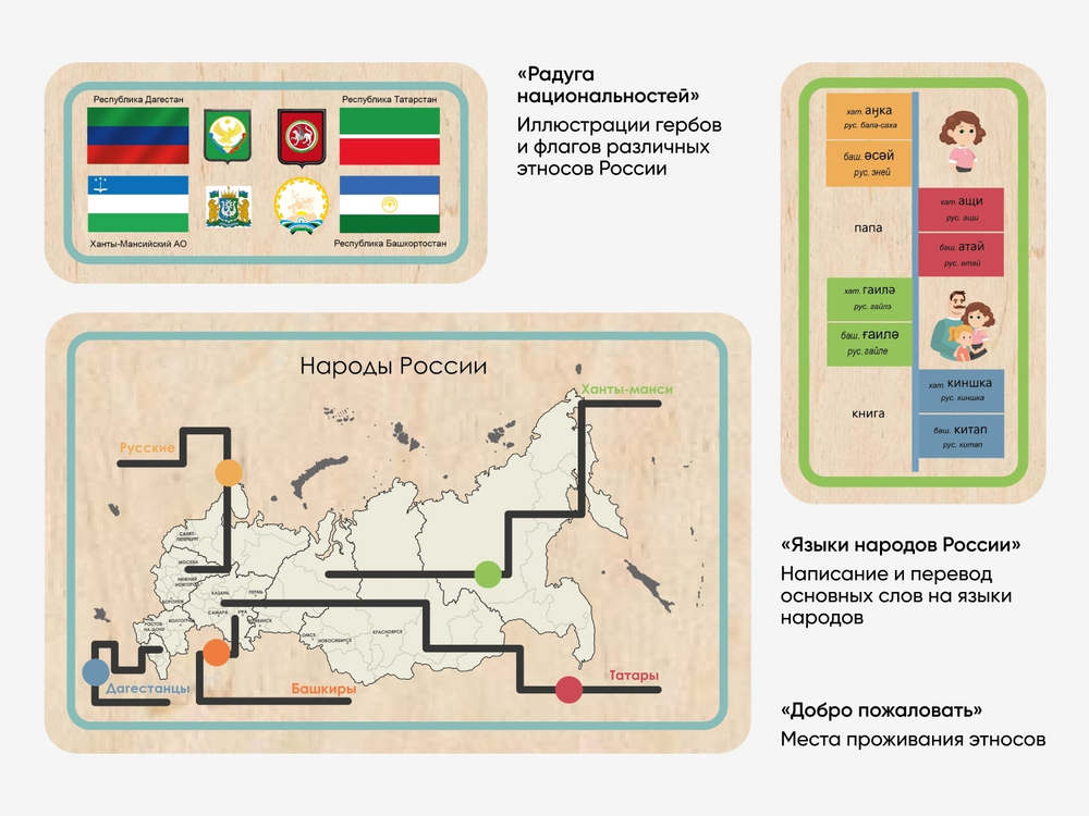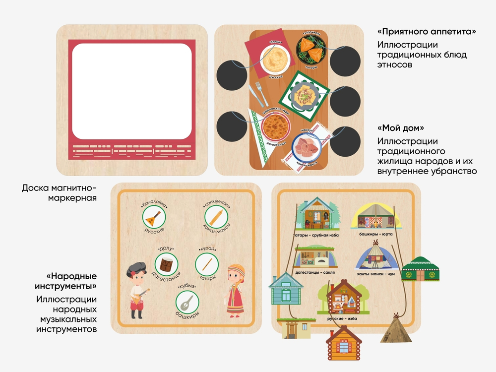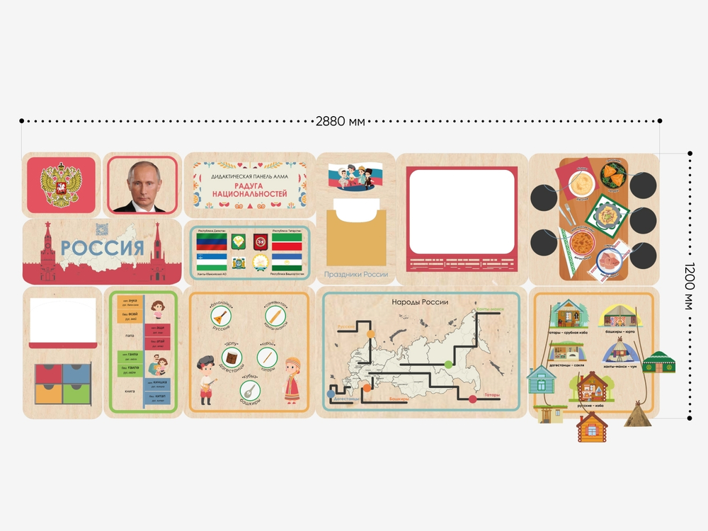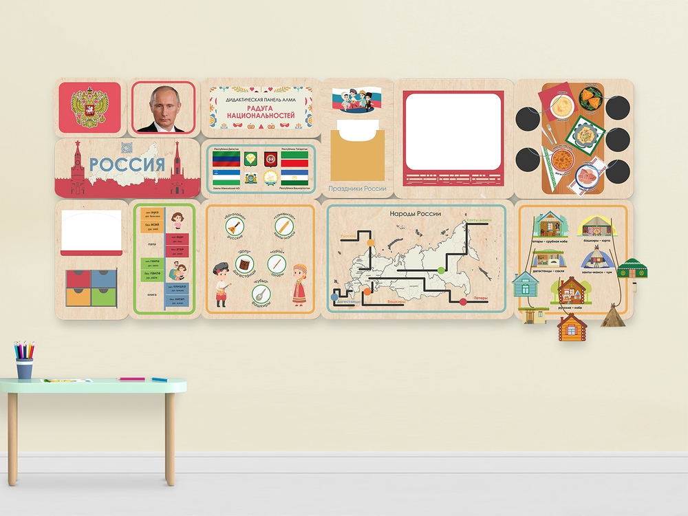 Комплект образовательных панелей «Радуга национальностей» создаст атмосферу гармонии, уважения и понимания культурных традиций среди юных граждан нашей страны. Это необходимое образовательное решение для каждого детского сада!