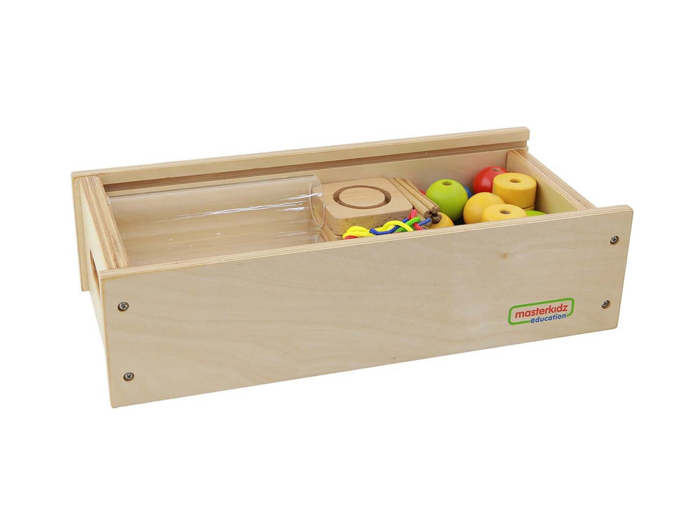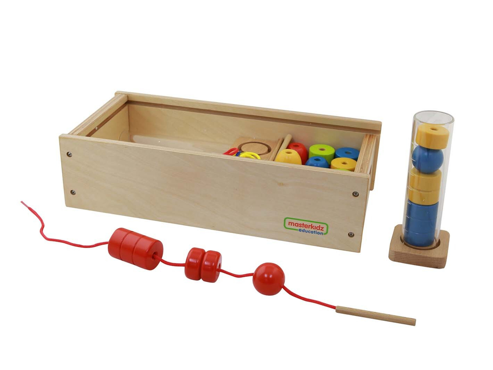 В набор входят разноцветные бусинки и шнуровки, а также 4 прозрачные пластиковые трубки для укладки бусинок. Бусинки имеют разную фому. Трубки с маркировкой, что облегчает для детей количественную оценку высоты каждой бусинки или комбинаций из них. Набор поставляется в прочном деревянном ящике для хранения.
