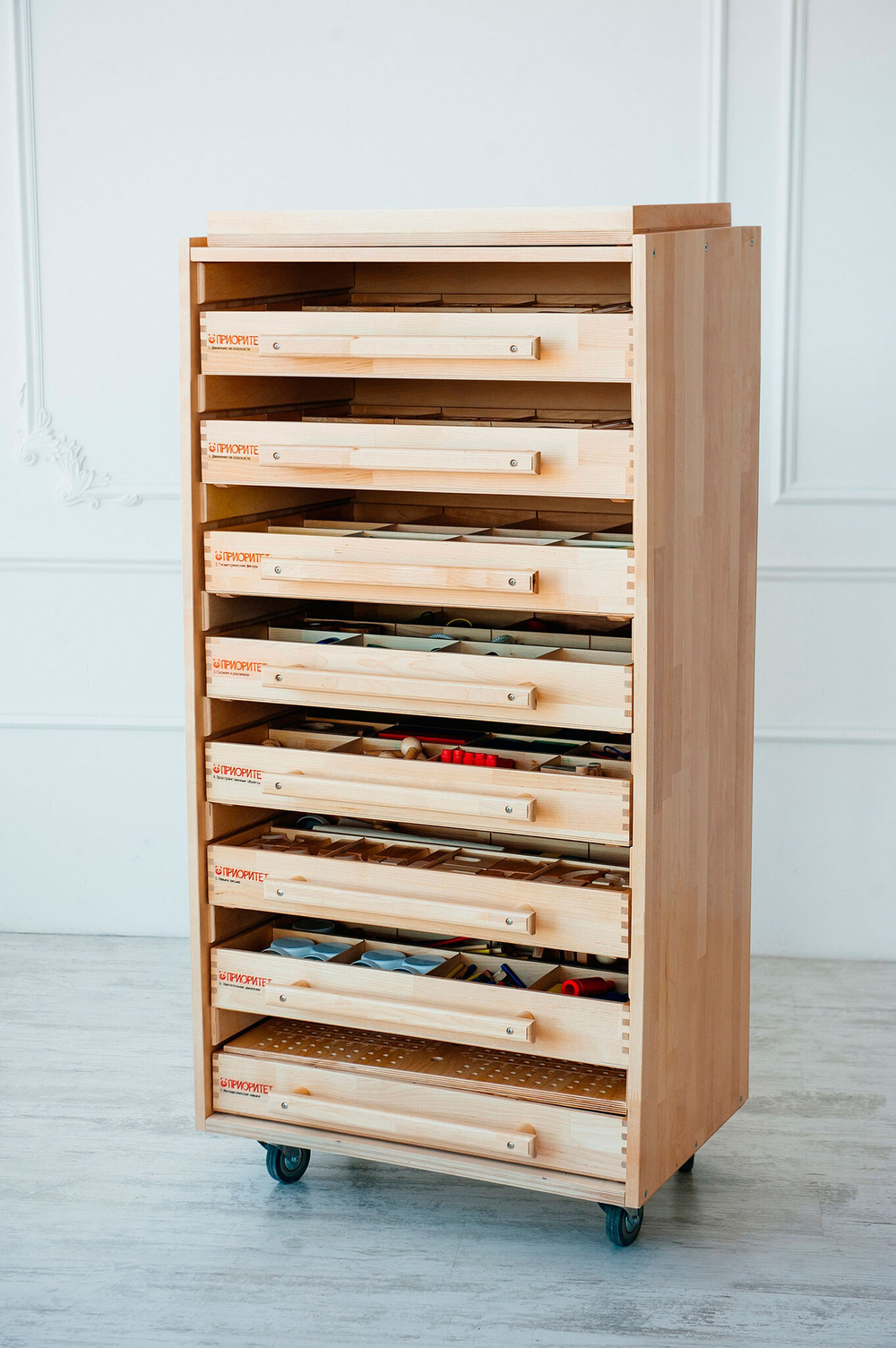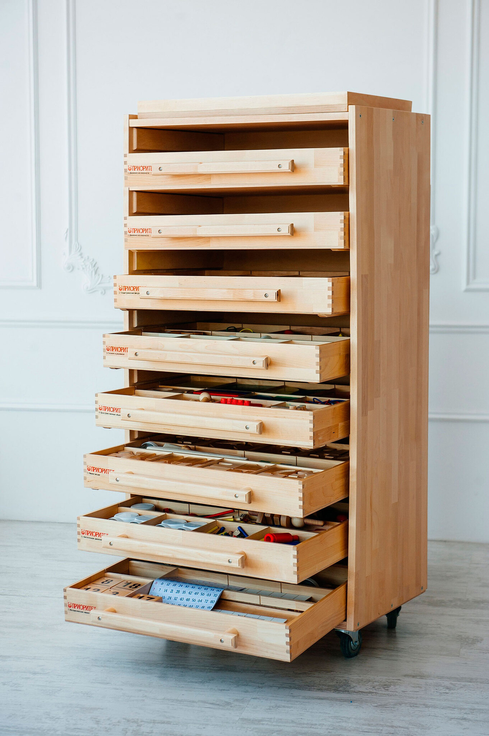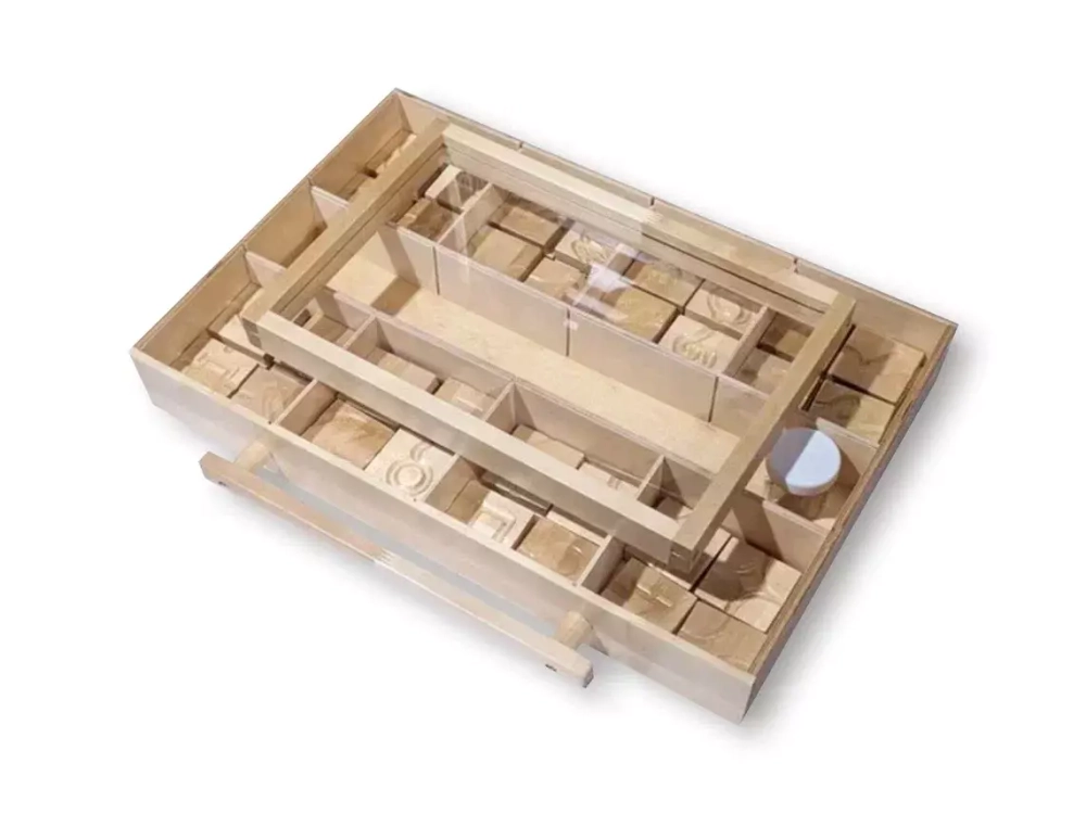 Детали целиком сделаны из натурального дерева: не имеют острых углов, тщательно отшлифованы от заусениц и покрыты лаком. Часть деталей оставлена в естественном окрасе, другая – покрашена безопасной водной краской. Каждая деталь имеет собственное место в модуле. Модули расположены в стеллаже на колесах, который удобно перевозить.