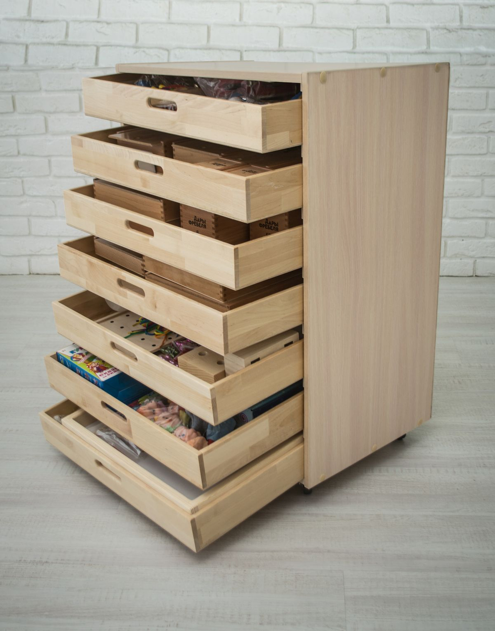 - Основной материал – древесина. Поверхности тщательно отшлифованы, некоторые детали покрыты краской насыщенного цвета.