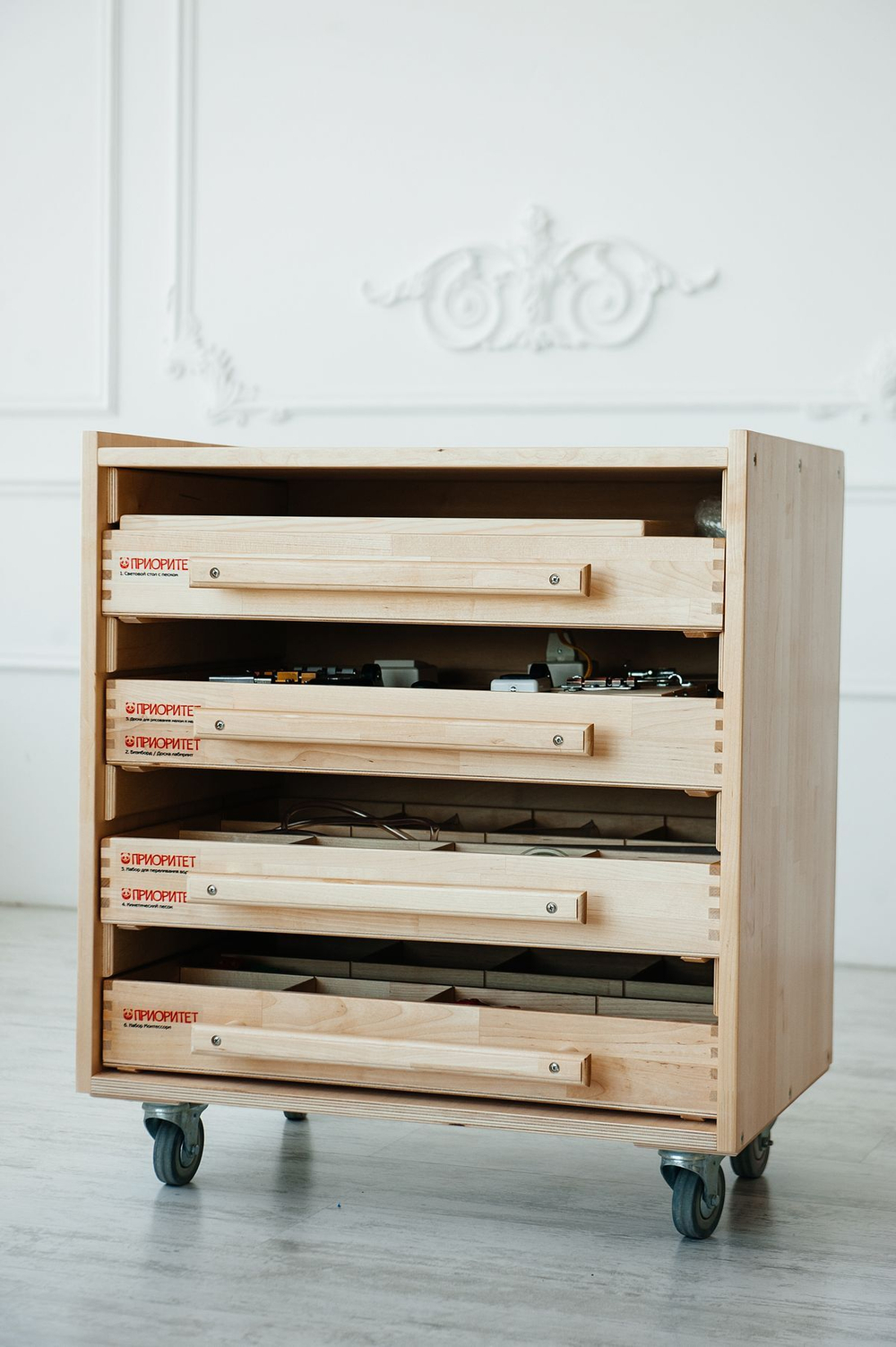 - Набор состоит из тематических модулей и комода. Стеллаж оснащен колесами для удобного перемещения всей конструкции. С помощью выдвижных ящиков удастся сохранить порядок в комнате, ведь все материалы будут аккуратно разложены по коробкам.