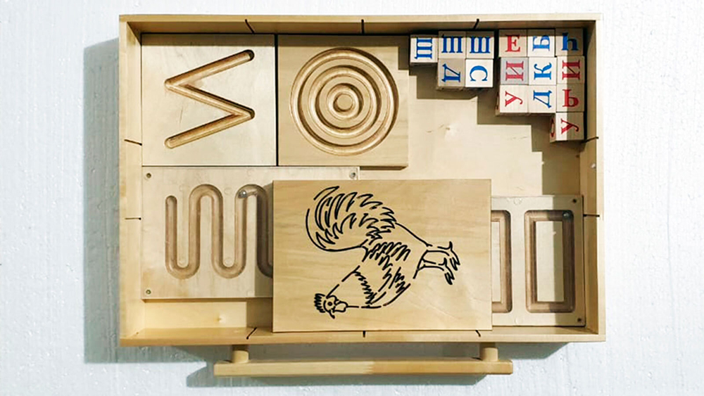 Тема модуля – письмо. Комплект направлен на активное разрабатывание кистей и пальцев рук. Во время занятий с панелями укрепляются мышцы рук, улучшается координация движений. Ребенок учится делать плавные движения кистями, после чего заметно улучшается почерк. С помощью кубиков можно изучать алфавит и составлять слова.