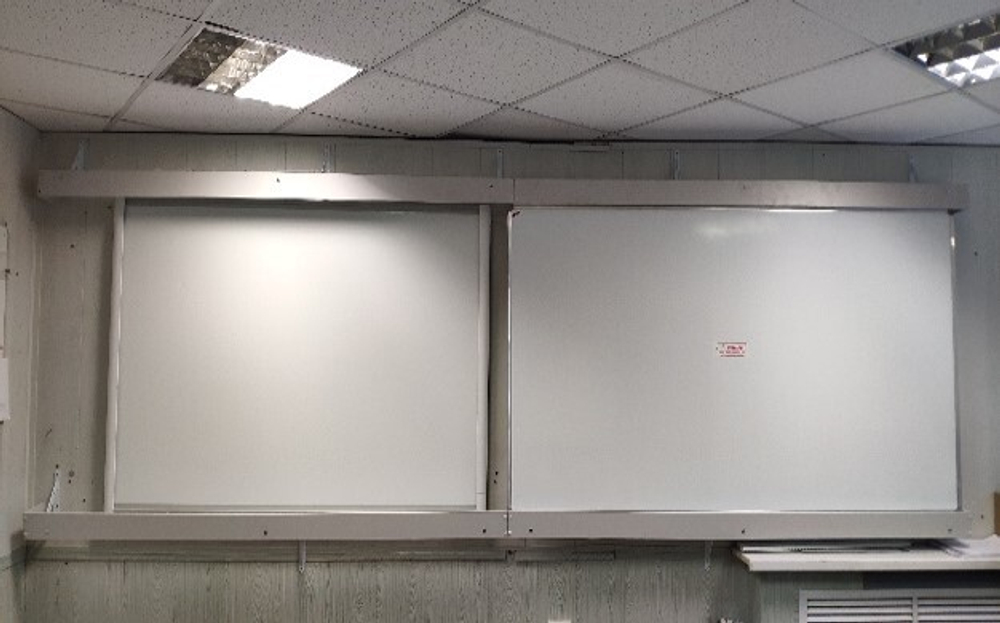 Рельсовая раздвижная система из одной стационарной и одной передвижной меловых или маркерных досок. Сбоку системы можно установить интерактивную доску, интерактивную панель, либо дополнительную классную доску.