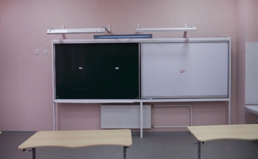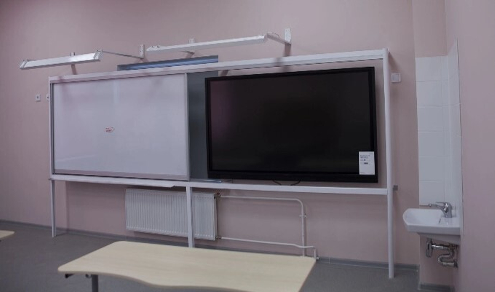 Рельсовая раздвижная система напольно-настенного типа состоит из одной стационарной и одной передвижной меловых или маркерных досок. Сбоку системы можно установить интерактивную доску, интерактивную панель, либо дополнительную классную доску.