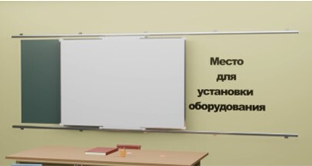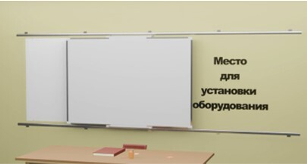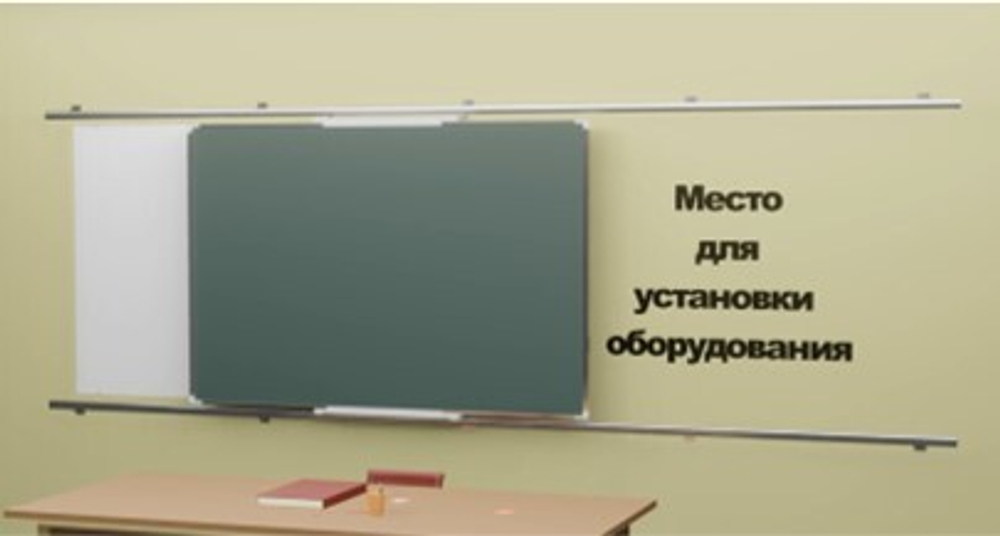 Рельсовая раздвижная система из одной стационарной и одной передвижной меловой или маркерной доски. Сбоку системы можно установить интерактивную доску, интерактивную панель до 86 дюймов, либо дополнительную классную доску.
