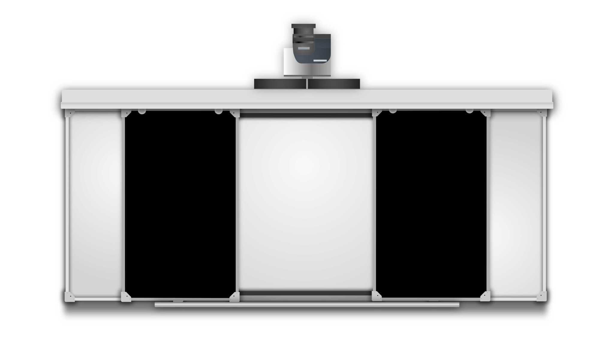 Слева и справа от интерактивной доски стационарно в стену крепятся две аудиторные доски. Еще две аудиторные доски крепятся в направляющий верхний профиль через систему кареток и имеют свободный ход. При необходимости преподаватель может закрыть интерактивную доску сдвинув их к центру либо раздвинуть их и работать на интерактивной доске.