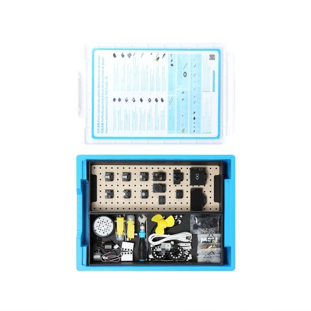 Набор содержит динамик, мотор, светодиодную ленту, светодиодное кольцо, светодиодную матрицу, вентилятор, датчик дальности, ИК-датчик движения, двойной датчик цвета, датчик угла поворота, блок расширения и литиевый АКБ.