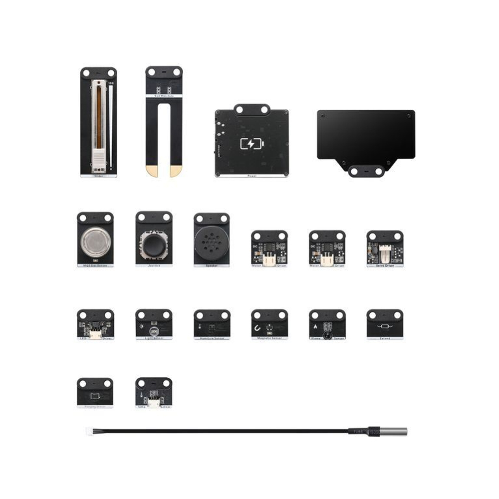 Набор содержит динамик, мотор, сервопривод, светодиодную ленту, светодиодное кольцо, светодиодную матрицу, водяную помпу, датчик дальности, реостат, датчик освещенности, датчик влажности почвы, джойстик, датчик температуры, датчик газа MQ2, датчик влажности, датчик пламени, магнитный датчик, модуль расширения и литиевая аккумуляторная батарея.