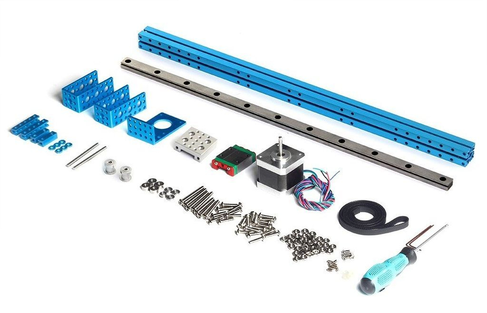 Набор представляет собой элементы для сборки линейной направляющей, используемой при проектировании мехатронных устройств раздела образовательной промышленной робототехники. Точное движение обеспечивается шаговым двигателем и ременной передачей.