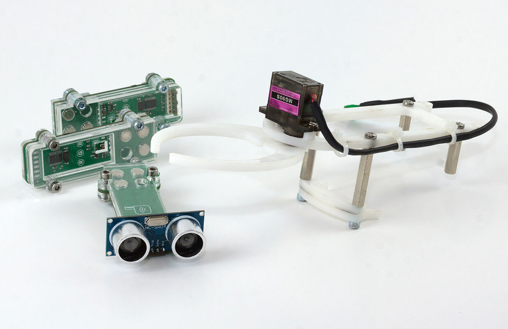 Ультразвуковой датчик, подключаемый посредством магнитных контактных площадок. В комплект должны входить: магниты-контактов, плата с датчиком, корпус из акрила и металлических метизов.