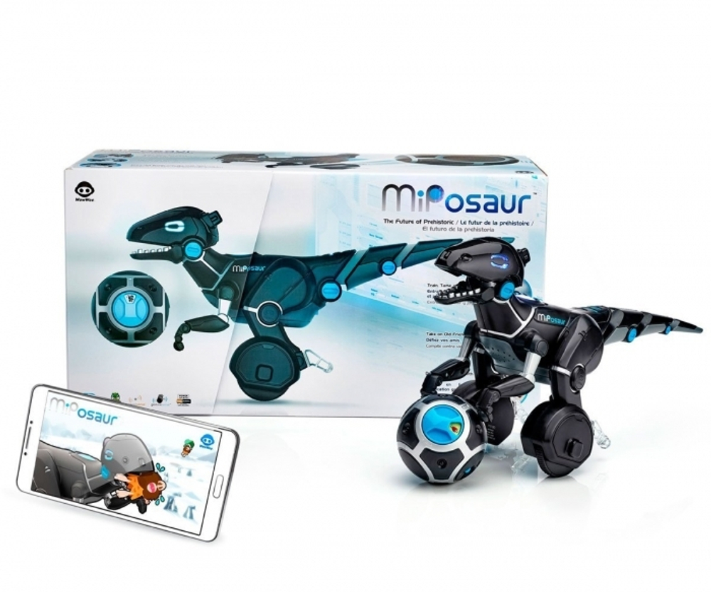 Новое поколение роботов WowWee – балансирующий динозавр Мипозавр. Робот управляется с помощью программы, которая устанавливается на смартфон. Поддерживаются телефоны на Apple и Android. Программа постоянно обновляется, так что динозавр в будущем будет учиться новым трюкам. Некоторые команды динозавр MiPosaur может получать с пульта, который идет в комплекте. Питание осуществляется от аккумулятора. Аккумулятор и зарядное устройство в комплекте. Робот способен различать несколько жестов. Он чувствует, если его потянуть за хвост, или закрыть руками глаза. По обе стороны головы у Мипозавра расположены датчики. Также робот оснащен звуковым датчиком, и может распознавать звуки, например хлопки. Пульт-мяч связывается с роботом по технологии Bluetooth. Можно включить команду "Поводок", и динозавр будет следовать за человеком, несущим мяч. Или режим "Мяч", и робот будет бегать за мячиком. Размеры: 48 х 20 х 25 см