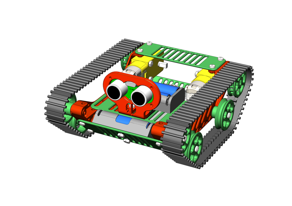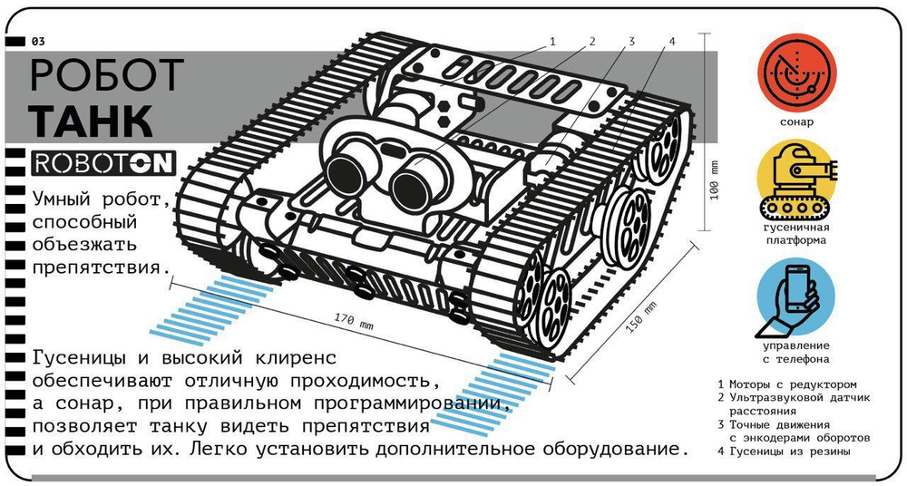 Робототехнический конструктор «Танк» является умным роботом, способным объезжать препятствия. Наличие большой базы дает возможность поместить на него различные объекты, в том числе датчики и сенсоры. За отличную проходимость робота отвечают наличие гусениц и высокого клиренса, а также большие углы въезда/съезда. Идущий в комплекте сонар позволяет танку видеть препятствия и обходить их при правильном программировании.