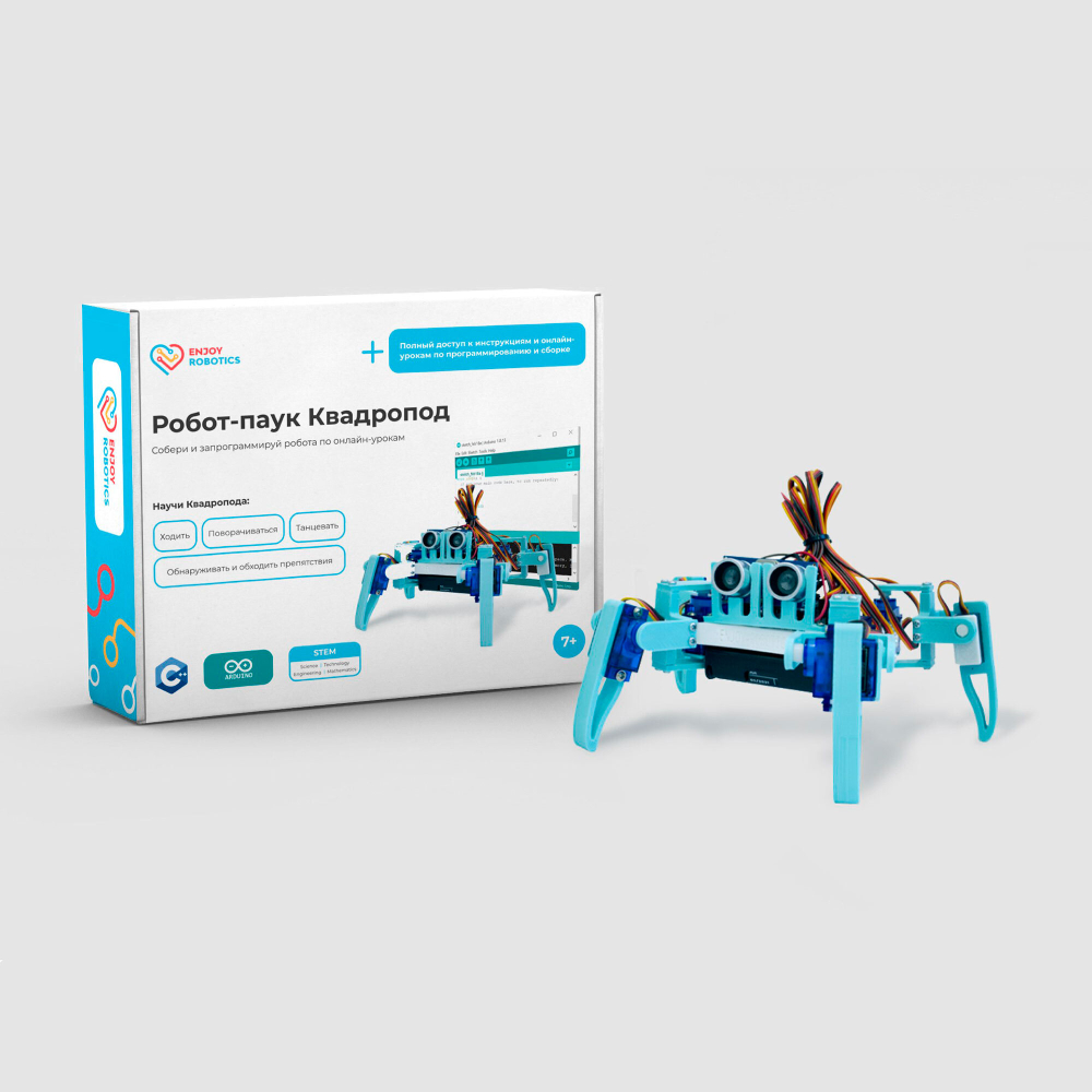 Обучающий конструктор Робот-паук Квадропод идеален для тех, кто хочет сделать по-настоящему интересный проект по робототехнике и получить продвинутые навыки в одном из наиболее востребованных языков программирования – C++ в среде Arduino IDE.