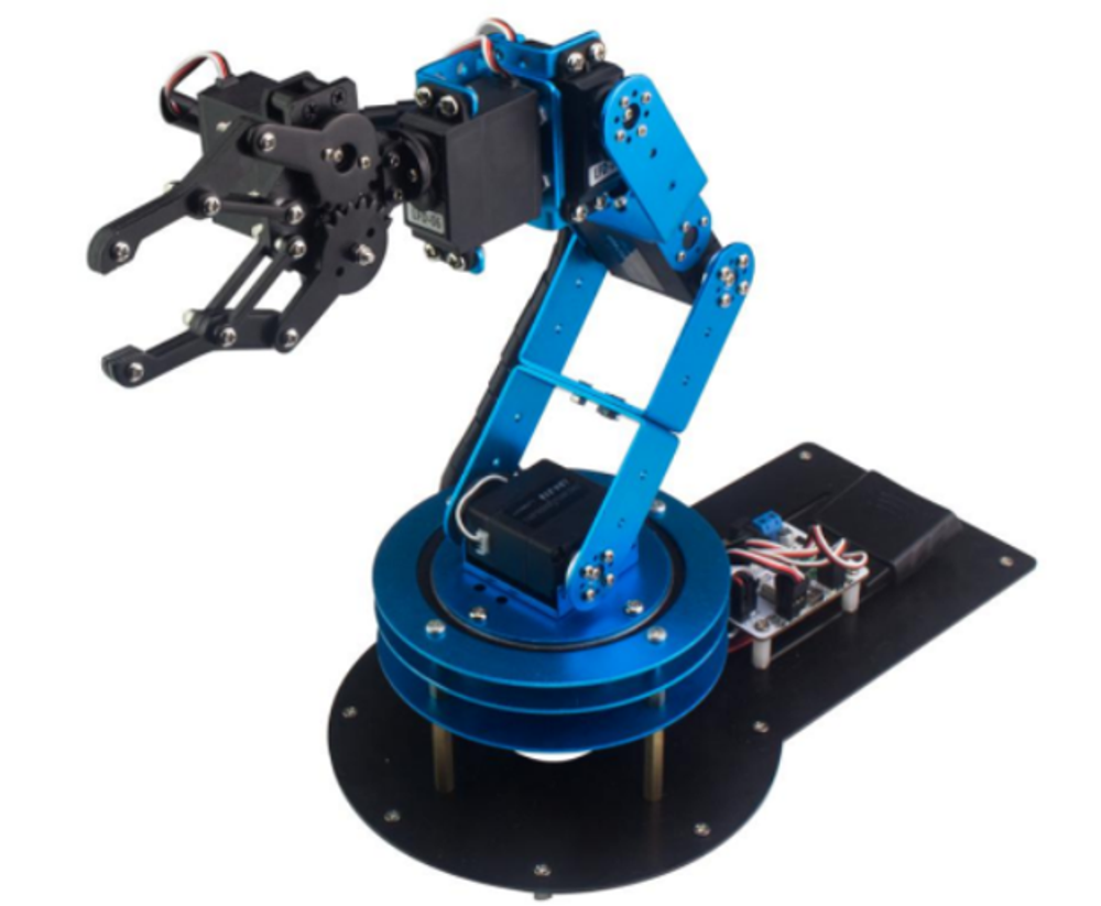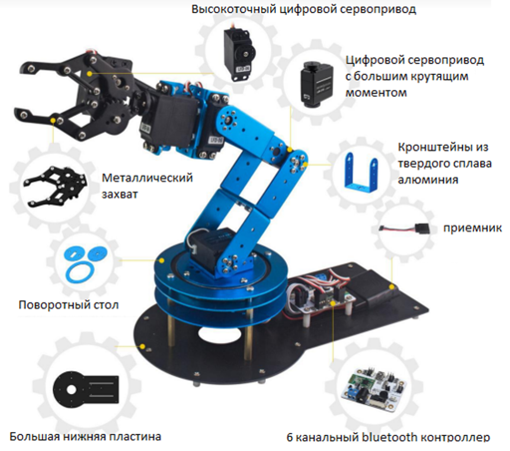 Роботизированный манипулятор Техник это набор для изучения манипулятора с 6 степенями свободы. Детали выполнены из прочного алюминиевого сплава. В комплекте есть джойстик и устройство захвата.