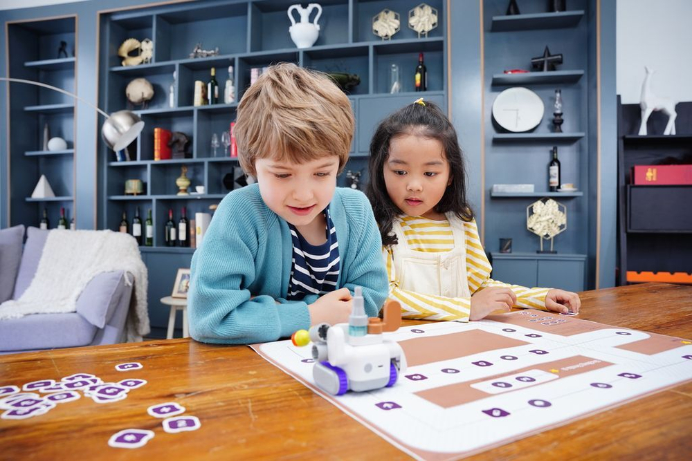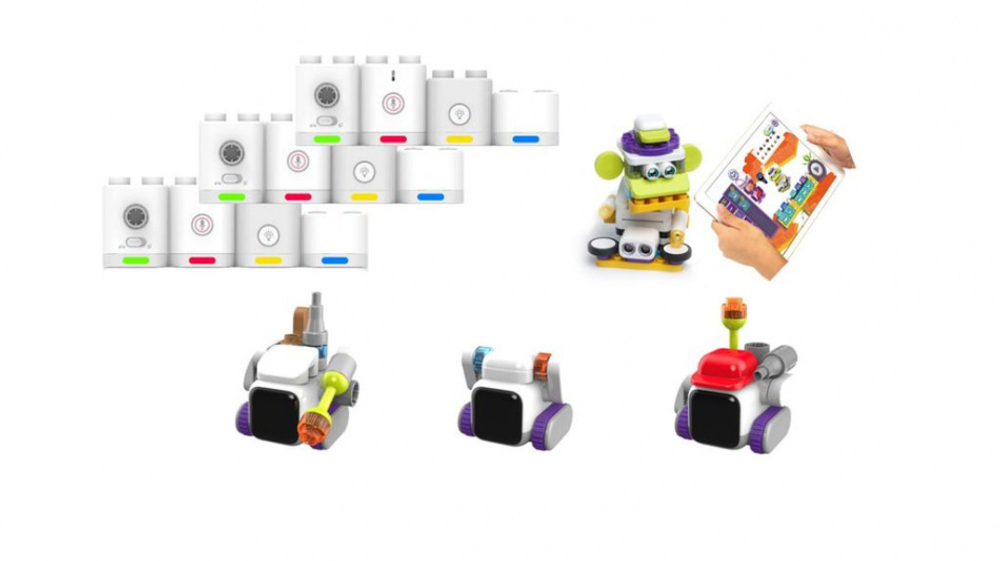 В составе комплекта также робот для детей от 4 лет, программируемый в упрощенно визуальной среде, для знакомства детей с началами блочного программирования, знакомства с устройством робота, с основными его элементами (датчики, силовые модули, контроллер), развития творческих и инженерных навыков в игровой форме. В составе робота содержится программируемый блок управления с двигателями и модулями связи, датчик расстояния, сервоприводный блок и конструктивные элементы для постройки робота. Программирование осуществляется в визуальной среде на мобильном устройстве с использованием игровой дополненной реальности. Подключение по Bluetooth. Робот может двигаться, светиться, танцевать, и издавать звуки.
