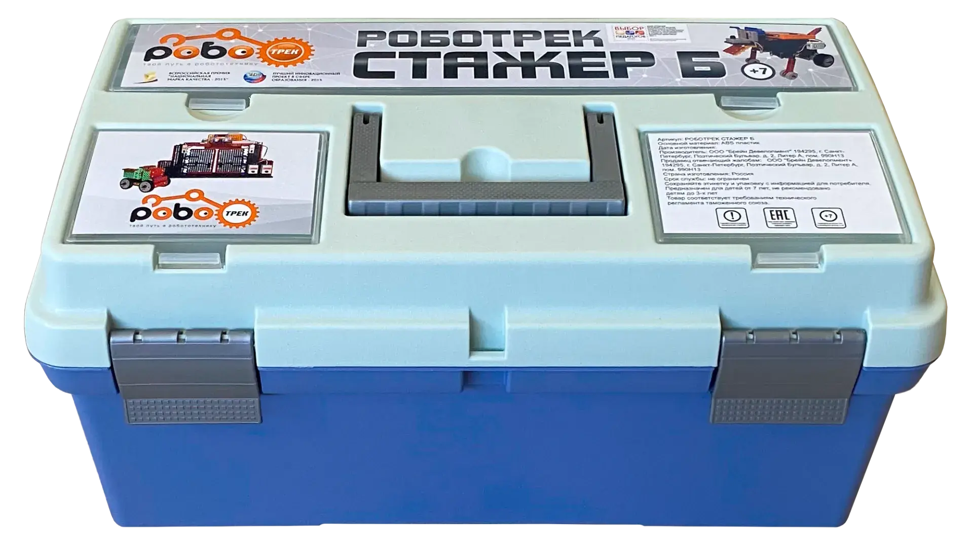 Робототехнический конструктор «РОБОТРЕК СТАЖЕР Б» предназначен для занятий по изучению основ робототехники, конструирования, программирования и интернета вещей (работа в специальном Web-приложении) для детей в возрасте от 7 до 15 лет. Состоит из начального и продвинутого уровней. В ходе работы с конструктором можно научиться проектировать как простые, так и сложные робототехнические установки, разрабатывать их и программировать. Модуль Wi-Fi позволяет подключаться к облачным серверам, управлять исполнителями и получать показания датчиков через Интернет. Конструктор содержит широкий спектр датчиков, позволяющих создавать модели интернета вещей и системы «Умный дом».