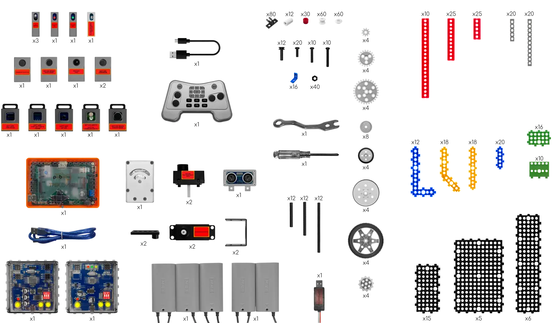Набор пластиковых валов (4 вида), пластиковых втулок (2 вида общим количеством 120 штук) и пластиковых, резиновых муфт (общим количеством 42 штуки), железных болтов (3 вида), гаек (40 штук);