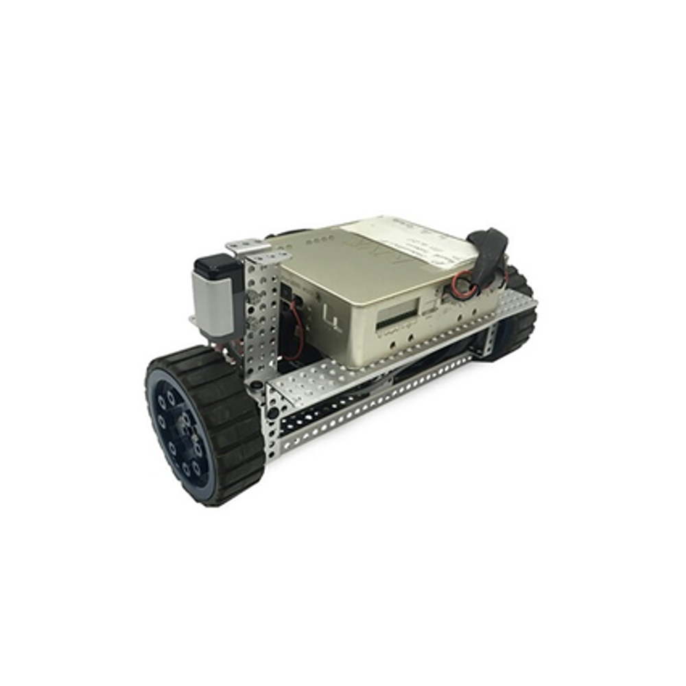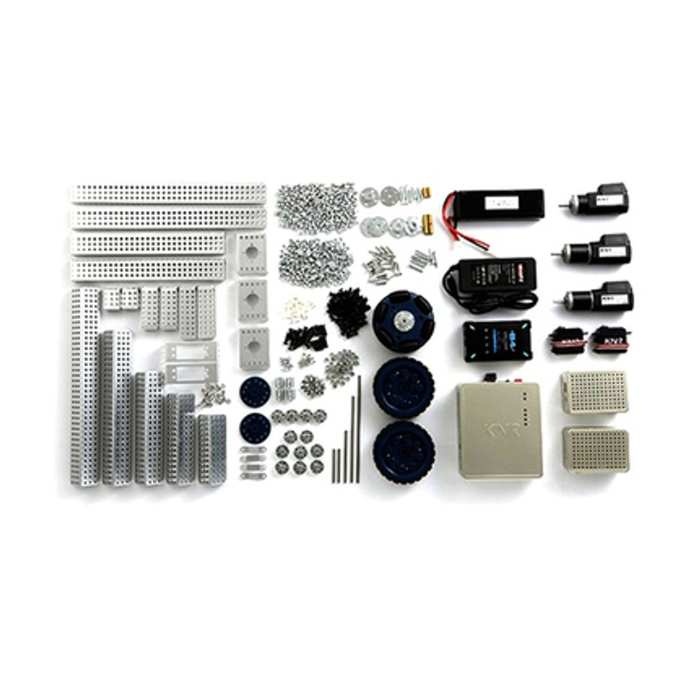 Набор содержит металлические конструктивные элементы (оси, колеса, пластины, балки, блоки, штифты, шпонки, втулки и тп.), а также три мотор-редуктора, два сервомотора, аккумулятор и зарядное устройство.