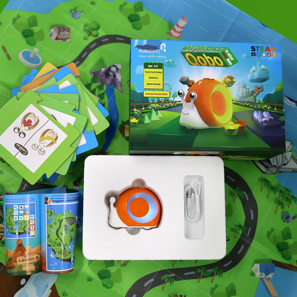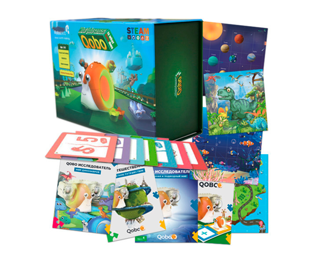 Набор Qobo – это не только интерактивный робот, созданный в виде улитки, но и комплект дидактического материала по основным темам естествознания, развития логики и программирования.