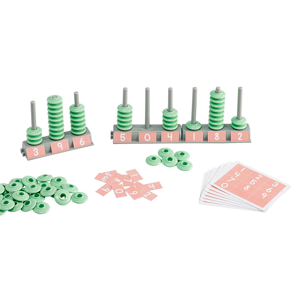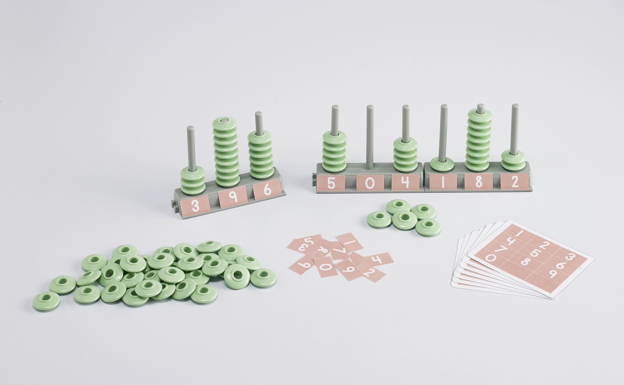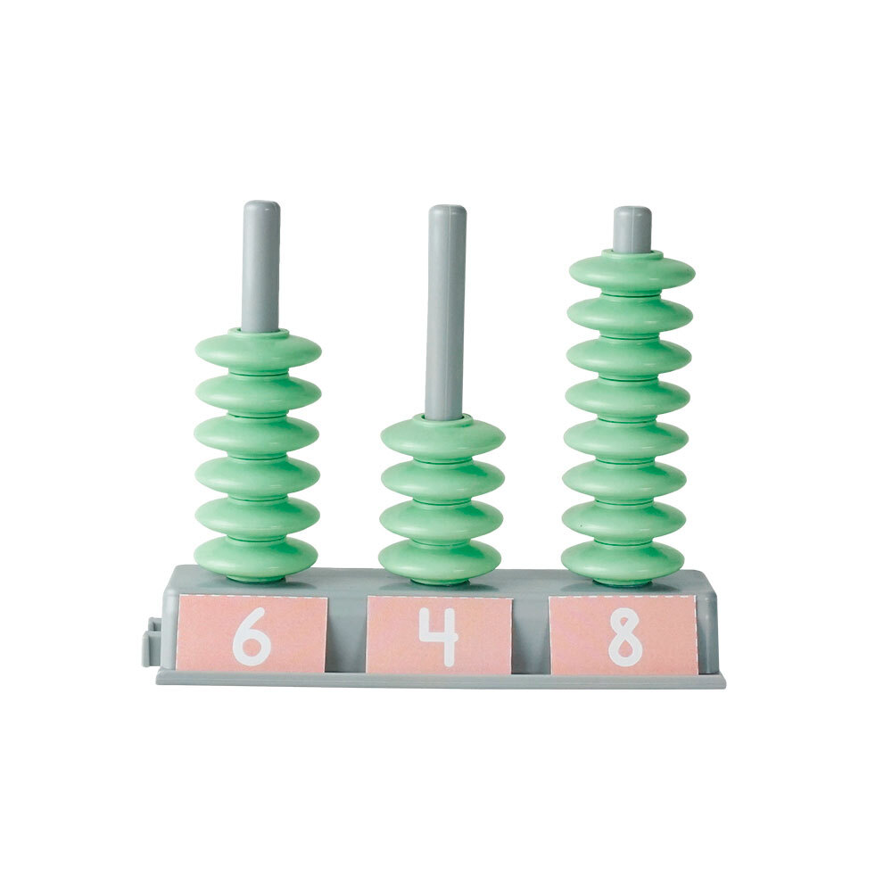 В наборе: 3 подставки, 9 стержней, 81 счетных бусин и 9 карточек с цифрами.