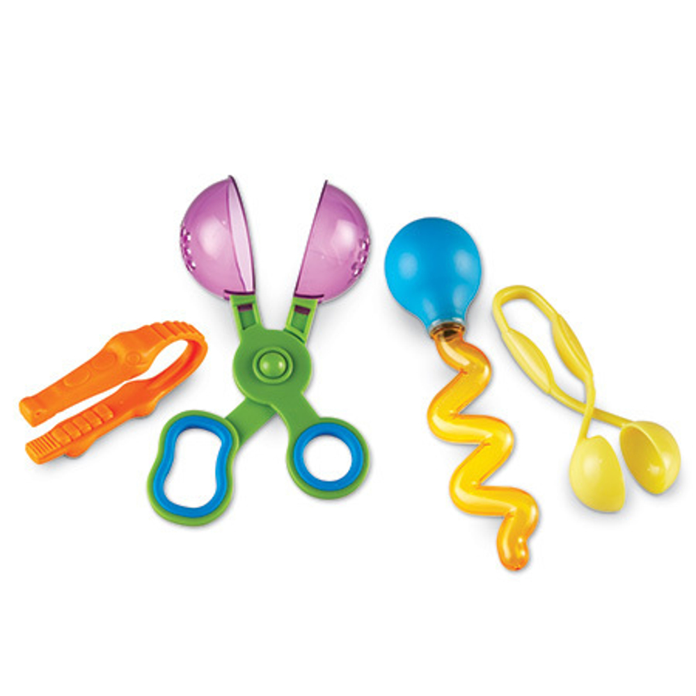 Чудесный набор «на все случаи жизни»! С этим набором из четырех предметов ребенок будет крутить, зачерпывать, сжимать предметы , тем самым развивая мышцы кисти. С помощью набора малыш сможет лучше овладеть навыками мелкой моторики, которые необходимы для того, чтобы научиться пользоваться ножницами и писать.