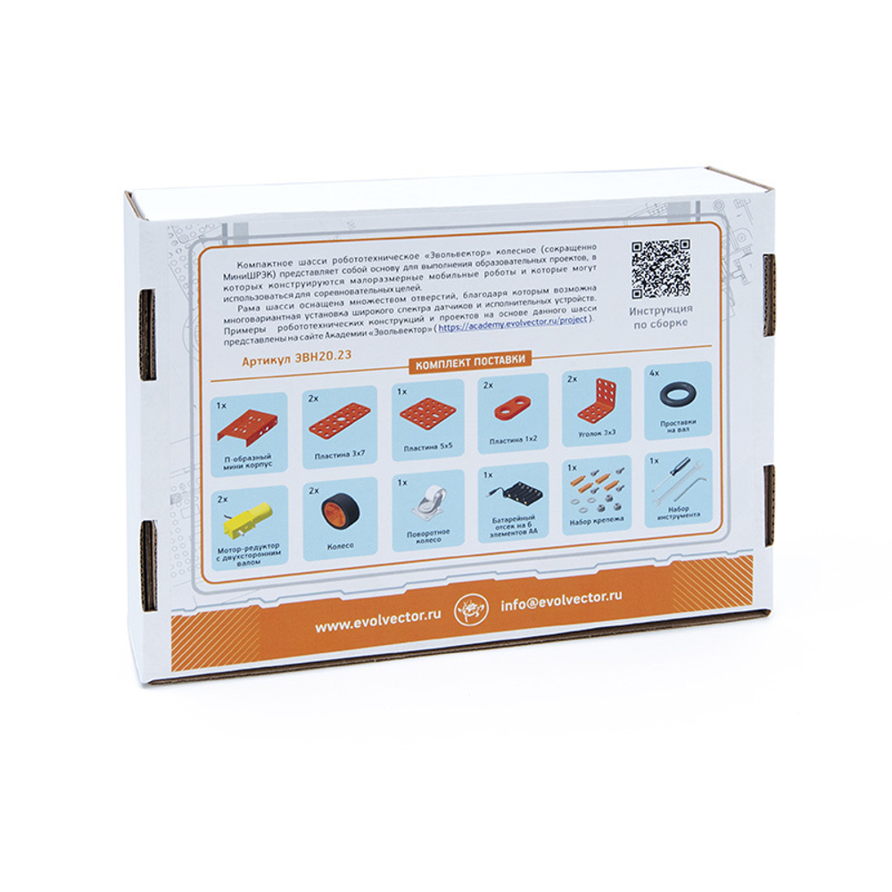 Компактное шасси робототехническое «Эвольвектор» колесное (сокращенно МиниШРЭК) представляет собой раму с закрепленными на ней мотор-редукторами и установленными на них колесами. Также шасси оснащено поворотным колесом. Таким образом получается мобильная трехколесная платформа с двумя ведущими колесами, которая может использоваться для создания моделей мобильных колесных роботов в образовательных или соревновательных целях.
