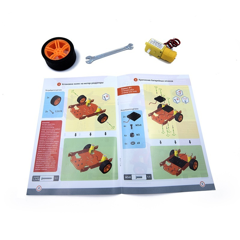 Существует два основных варианта исполнения: трехколесное (два ведущих колеса и одно поворотное) и четырехколесное (все четыре колеса ведущие). На любой из модификаций предусмотрены крепежные отверстия для установки стандартного контроллера Ардуино или одноплатного компьютера Raspberry Pi. Дополнительно на корпусе предусмотрены отверстия для крепления различных конструкций, датчиков и прочего оборудования.