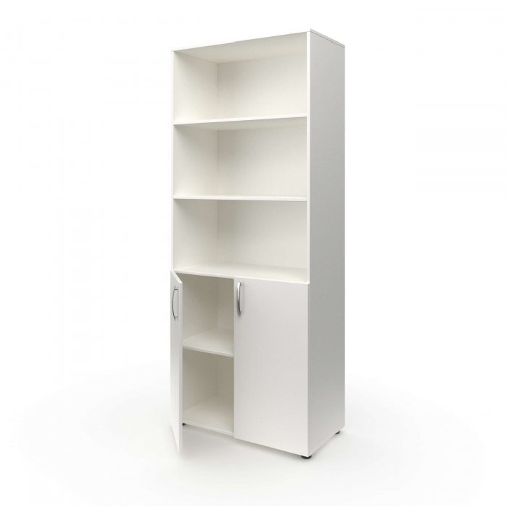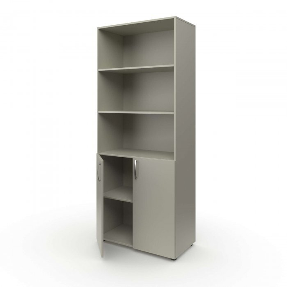Шкаф состоит из 2-х отделений. Нижнее отделение закрыто глухими фасадами и оснащено съемной полкой. Торцы фасадов нижнего отделения закрыты противоударной кромкой ПВХ 2мм. Верхнее отделение шкафа открытое и оснащено 2-я съемными полками. Шкаф производится из ЛДСП толщиной 16мм, торцы корпуса закрыты противоударной кромкой ПВХ. Ручки на фасадах металлические серого цвета. Для компенсации неровностей пола шкаф оснащен регулируемыми опорами высотой 30мм.