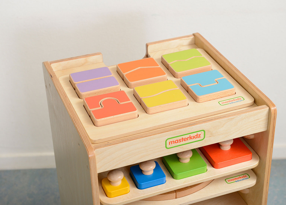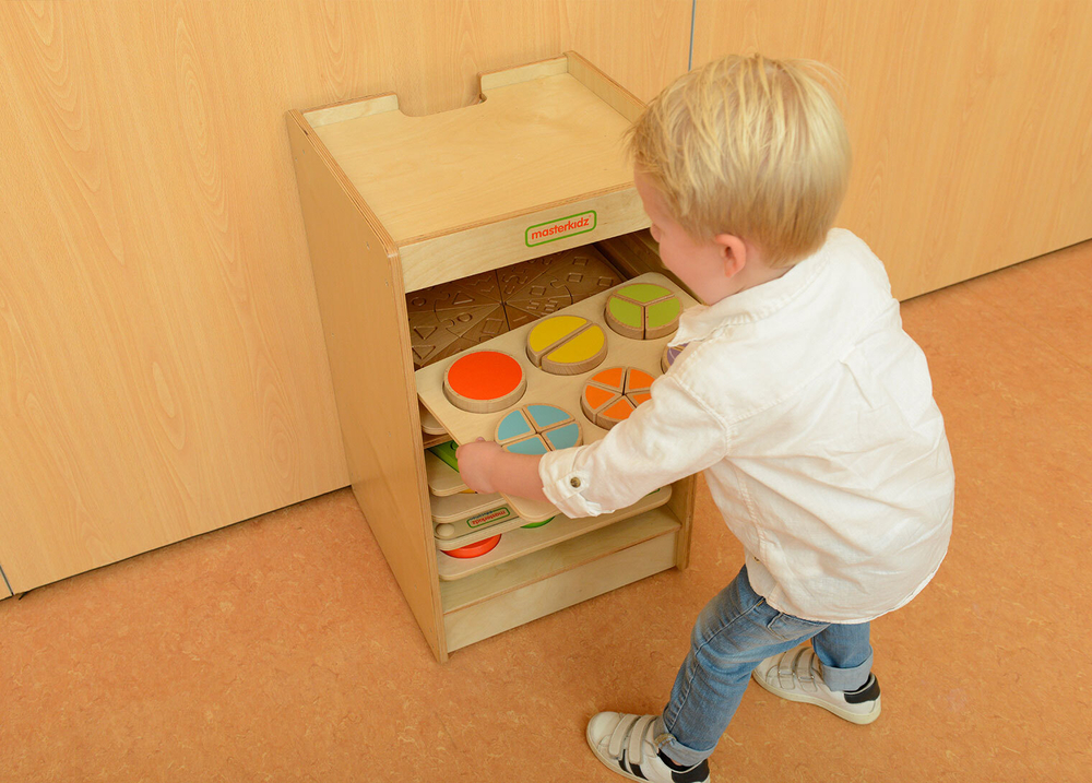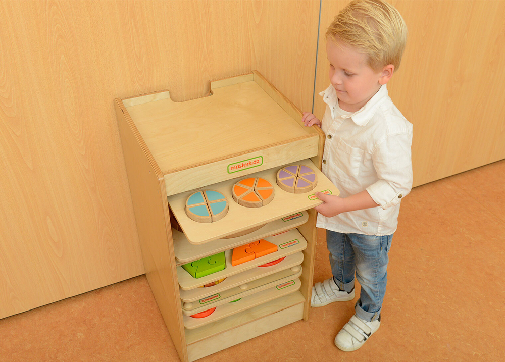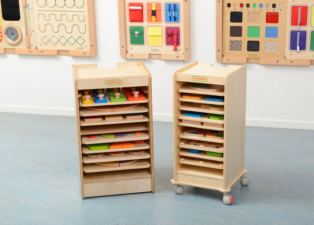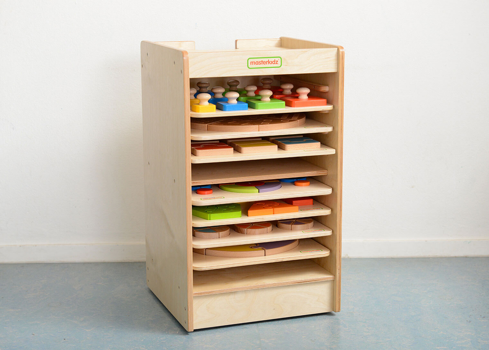 Стеллаж выполнен из березовой фанеры. Верхняя часть предназаначена для размещения панелей размером 38x28 см. Внутри расположены 10 направляющих в виде полозьев для размещения игровых панелей. В комплекте идет дополнительная опорная панель с колесиками для удобного перемещения.