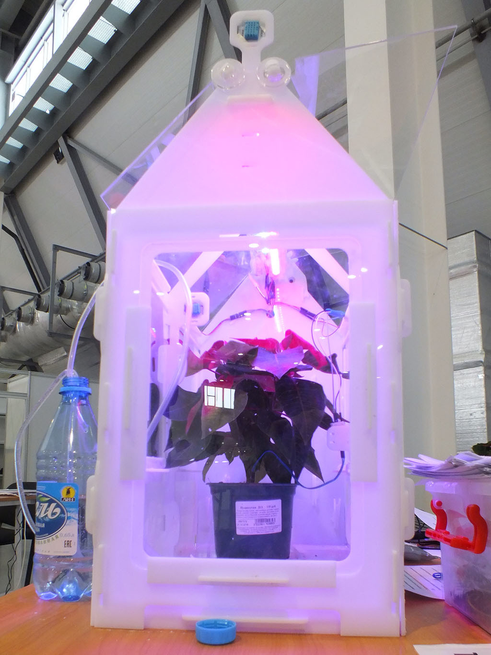 Модули и устройства, входящие в комплект позволяют управлять всеми процессами в теплице через интернет. Теплица выполнена из пищевого пластика и оргстекла. Спектр освещения подобран для более быстрого роста растений.