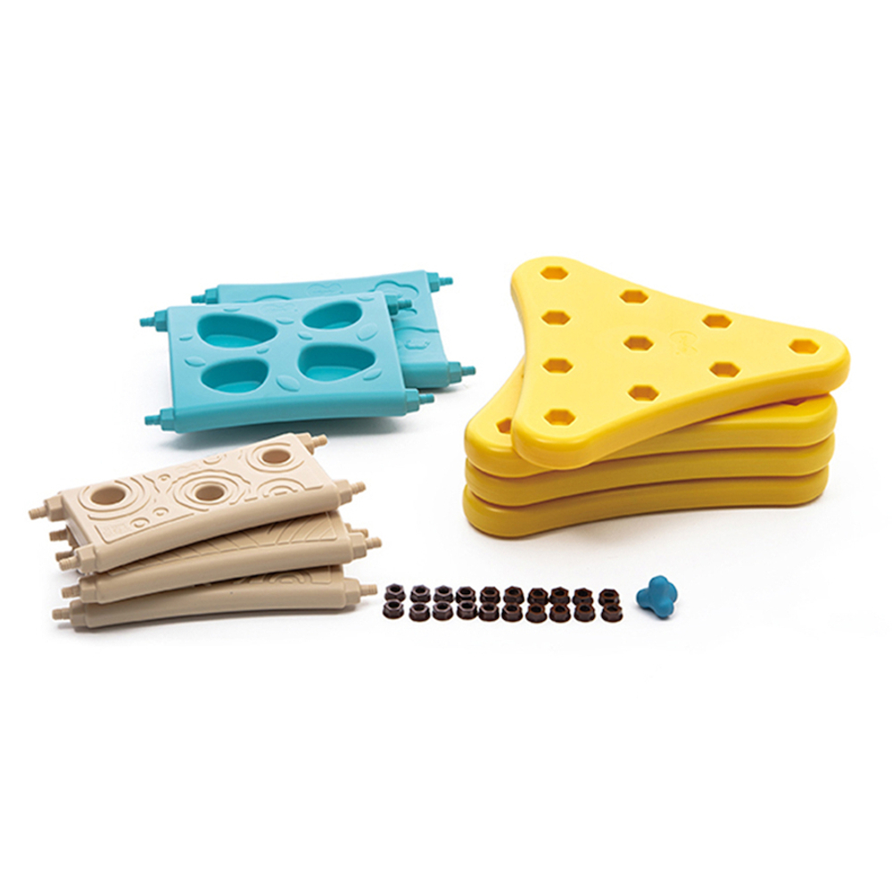 Занятия развивают у детей моторную координацию, физическую силу и гибкость движений тела. Углубления на широкой и узкой досках предназначены для лазания и подходят для детских рук и ног. Эти углубления помогают детям легко и безопасно лазать. Благодаря множеству отверстий на треугольной доске, широкая и узкая доски могут быть собраны в различных положениях и легко собираются с помощью прилагаемых гаек. Комбинации можно менять в зависимости от цели деятельности, например, скалодром, пещера или лестница.