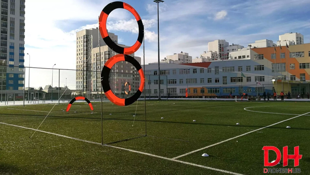 Трасса для проведения соревнований по дрон-рейсингу, включающая в себя поворотные флаги, курсовые ворота, площадку для взлета-посадки, систему автоматической фиксации пролетов.
