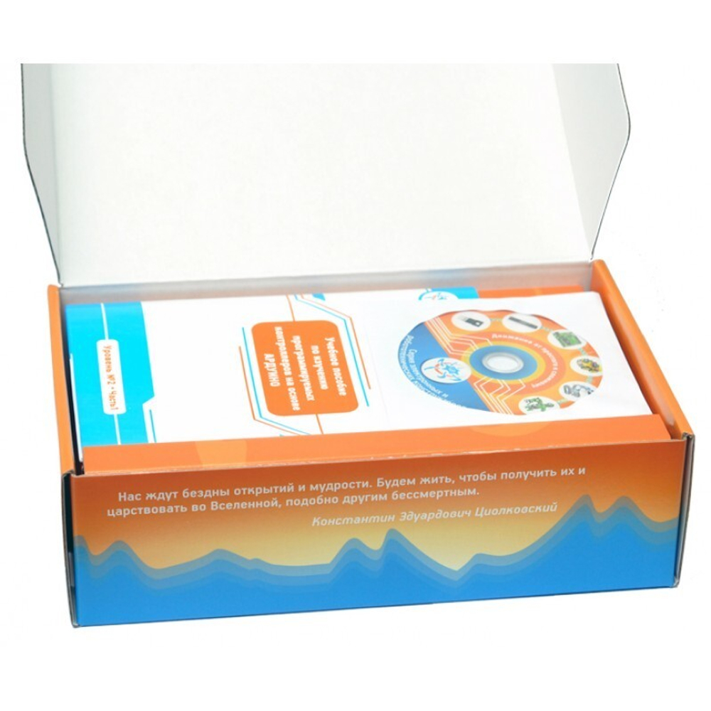 Набор включает в себя учебное пособие, содержащее первые 7 уроков, диск с примерами готовых программ и программным обеспечением для работы с платой (Arduino IDE), а также контроллер на платформе Ардуино, макетную плату и совместимые с контроллером электронные компоненты, необходимые для проведения учебных экспериментов.