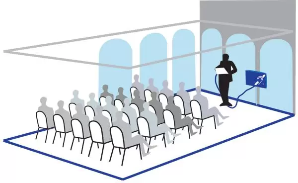 Стационарная индукционная петля монтируется в пол, потолок или стены по периметру помещения и соединяется с усилителем, расположенным в непосредственной близости от петли. Питание усилителя осуществляется от сети переменного тока. Звуковая информация поступает на микрофон и передается в слуховой аппарат посредством электромагнитной индукции (режим «Т») равномерно во всей зоне охвата петли. Стационарная индукционная петля может быть подключена к системам оповещения, громкой связи и другим источникам сигнала.