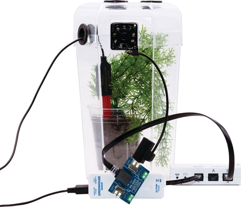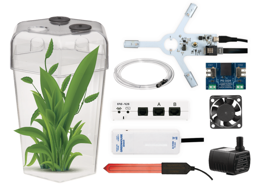 В комплекте находится беспроводное устройство управления //Control.Node, который служит центром управления теплицей, обеспечивая питание датчиков, устройств и аксессуаров и хранилище для программного кода. Оснащённый акселерометром, аккумулятором и несколькими портами для аксессуаров, //control.Node действует как универсальное устройство управления, позволяя подключаться к любому датчику PASCO или проекту STEM Sense.