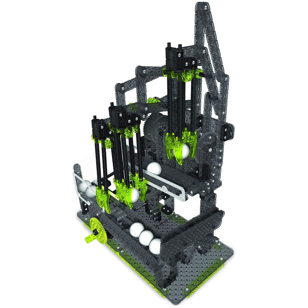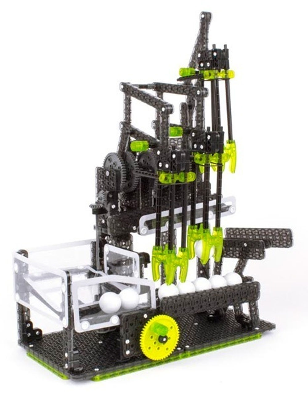"Первые Манипуляторы 2" VEX Robotics - это полнофункциональный набор для сборки, созданный на основе реальных промышленных роботов-манипуляторов. Роботизированная рука, созданная с помощью этого набора способна забирать и перемещать предметы, используя четыре степени свободы и шарнирную руку с грейферным захватом. Вся конструкция может поворачиваться на 360 градусов, позволяя этому миниатюрному роботу выполнять сложные действия своего реального промышленного прототипа. Машина-манипулятор для мячей, с помощью трех рук может захватывать и перемещать шары на трек непрерывно.
