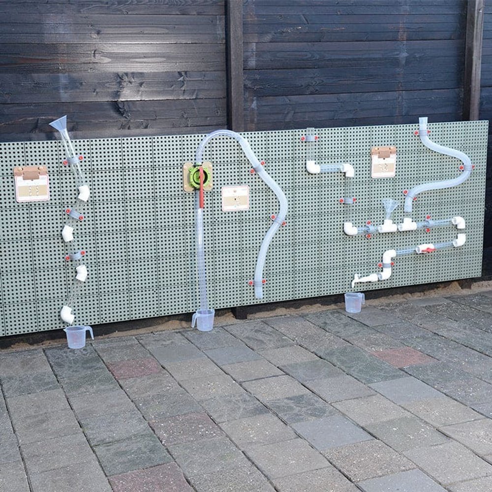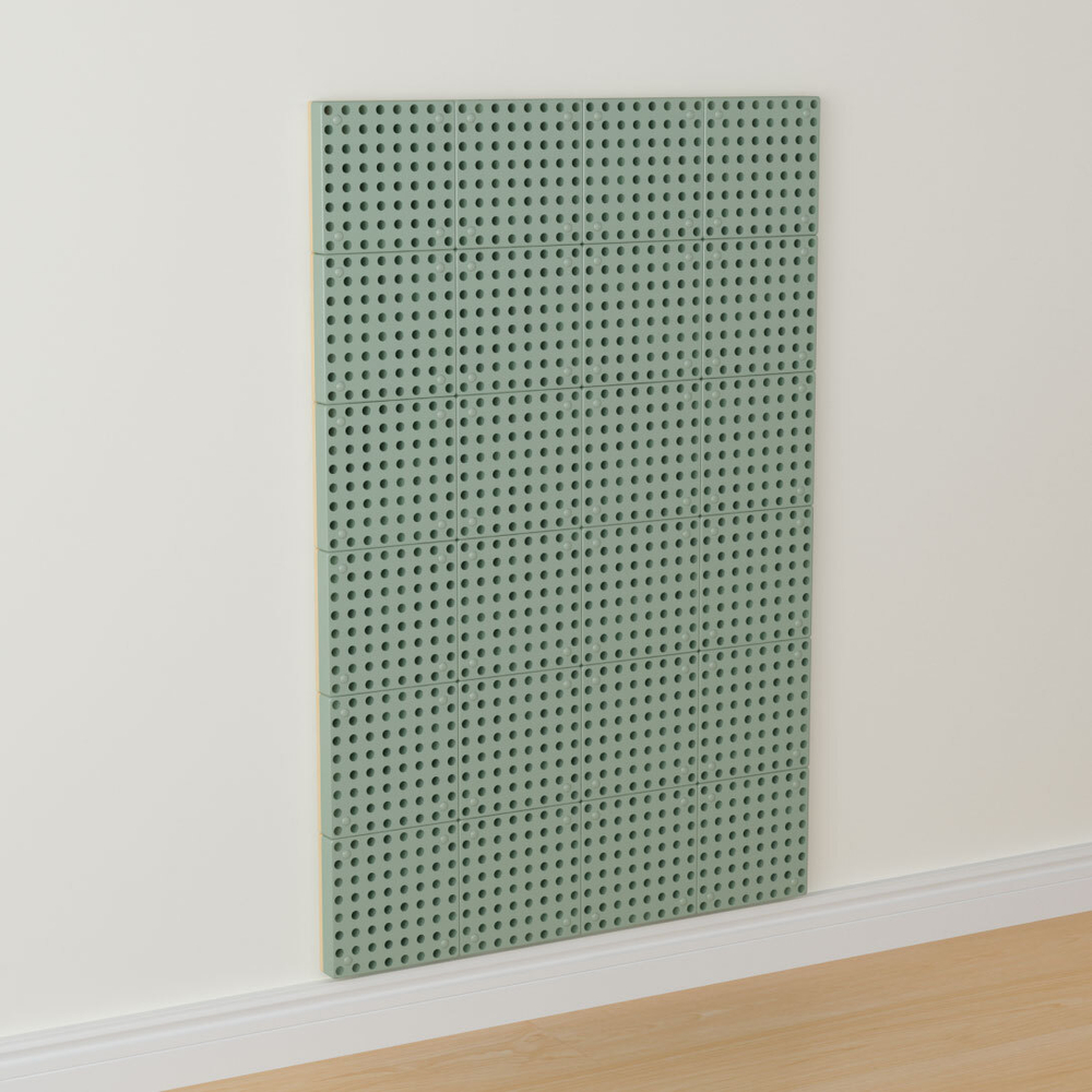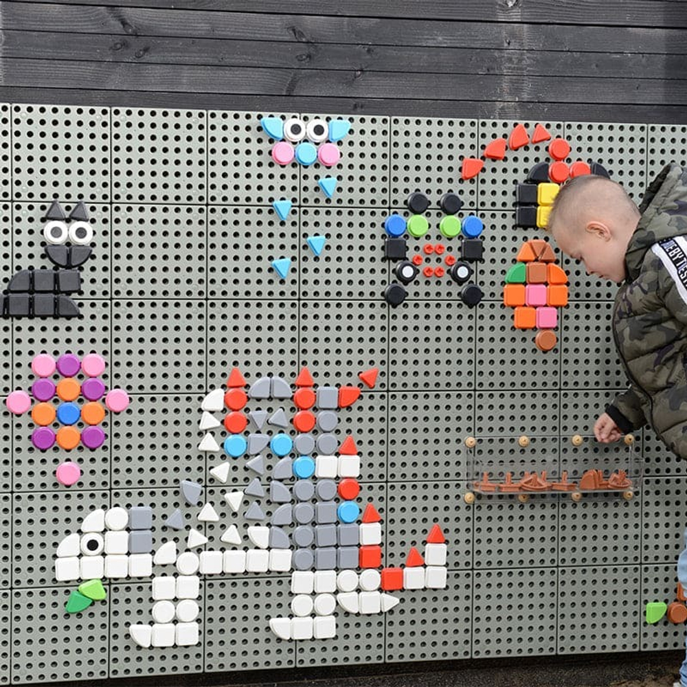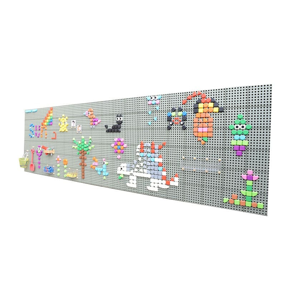 Основание панели крепится к уличной стене. Для монтажа образовательных наборов система комплектуется пластиковыми панелями с круглыми отверстиями в количестве 24 шт.