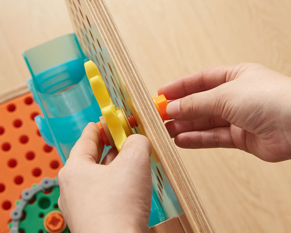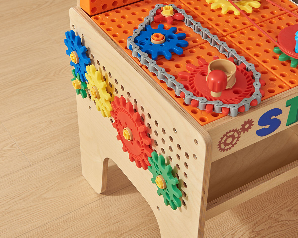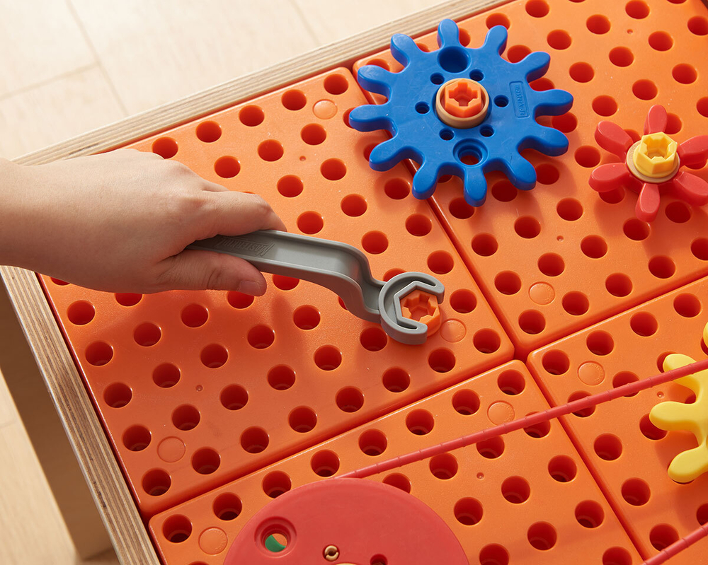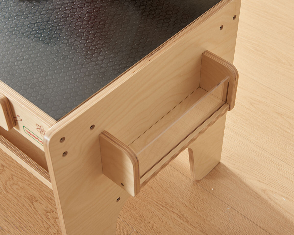 В верхней и боковой частях стола расположены сквозные отверстия для вкручивания винтов, шестеренок и крепления различных пособий, что позволяет задействовать в игровом процессе сразу несколько детей.