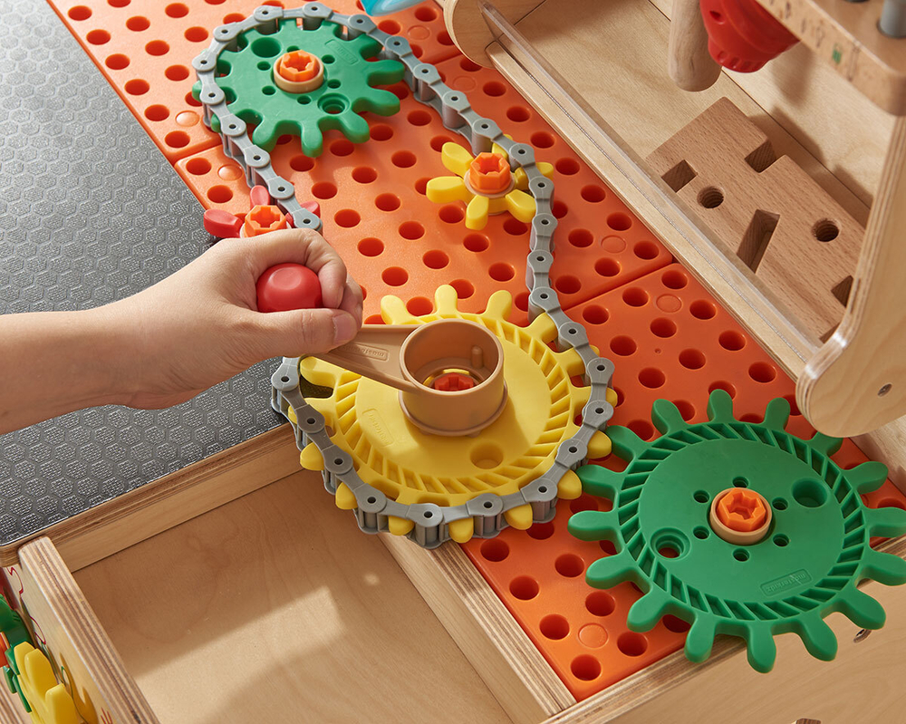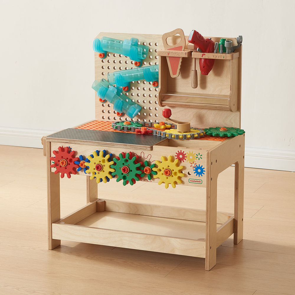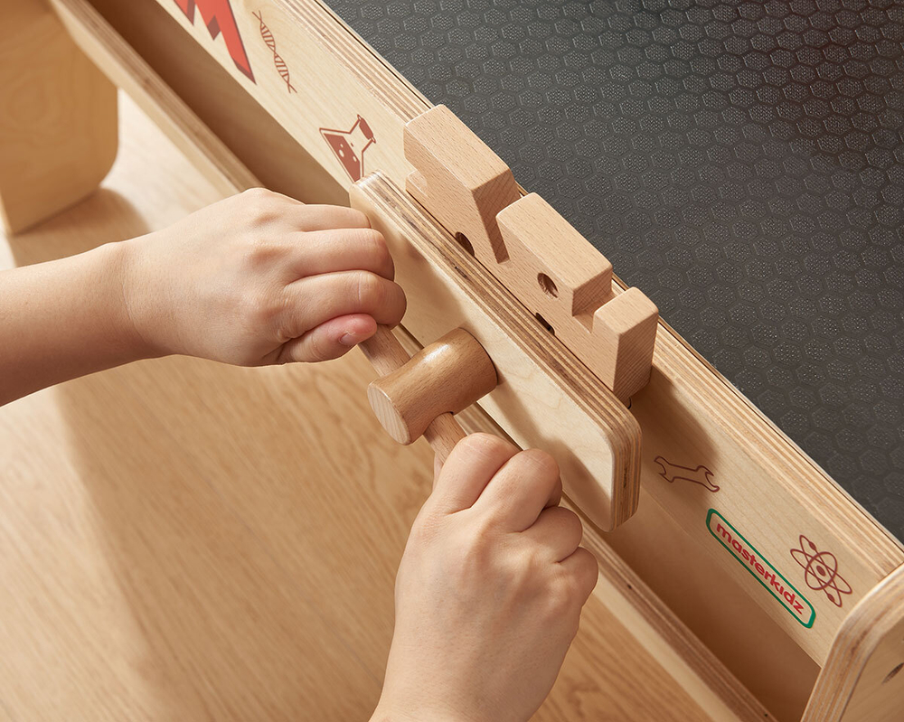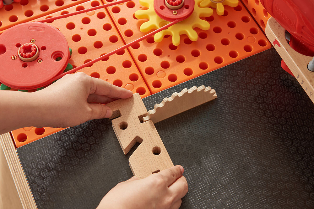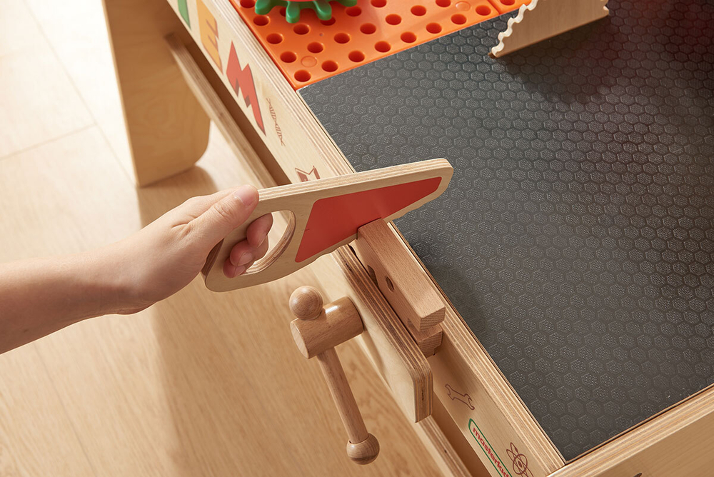 Детская мастерская изготовлена из прочных и экологичных материалов, вмещает все необходимые инструменты (пила, шуроповерт с насадками, винты, гвоздодер, молоток, гаечный ключ).
