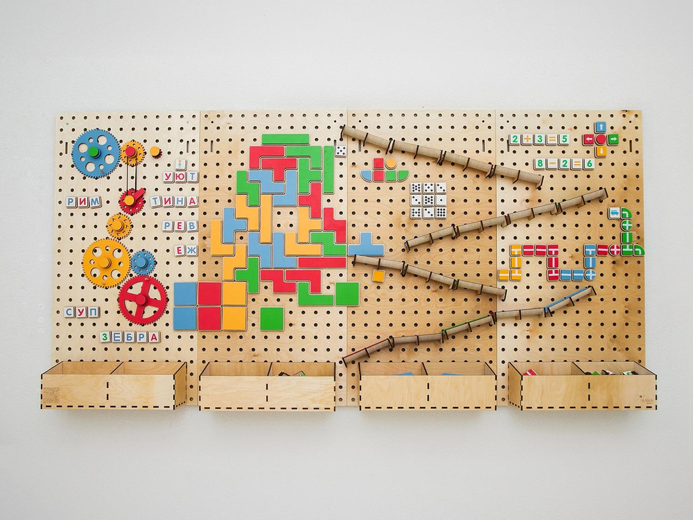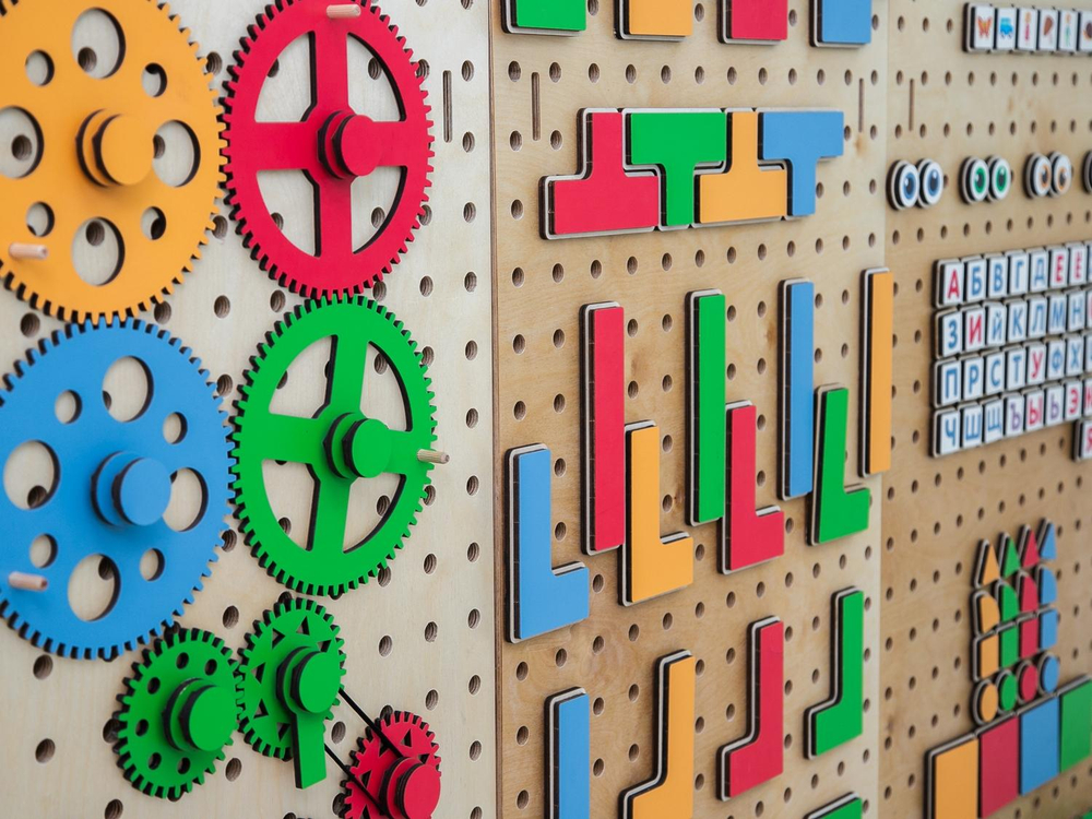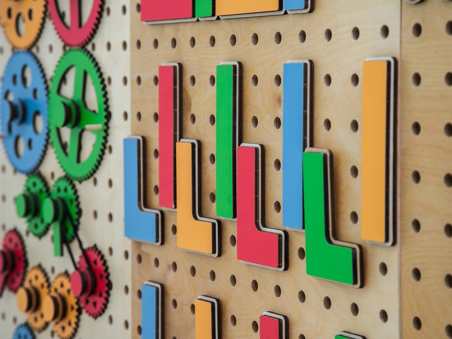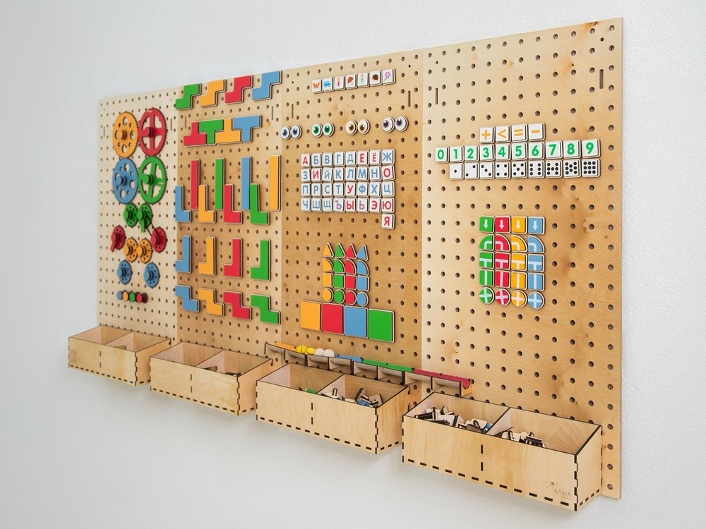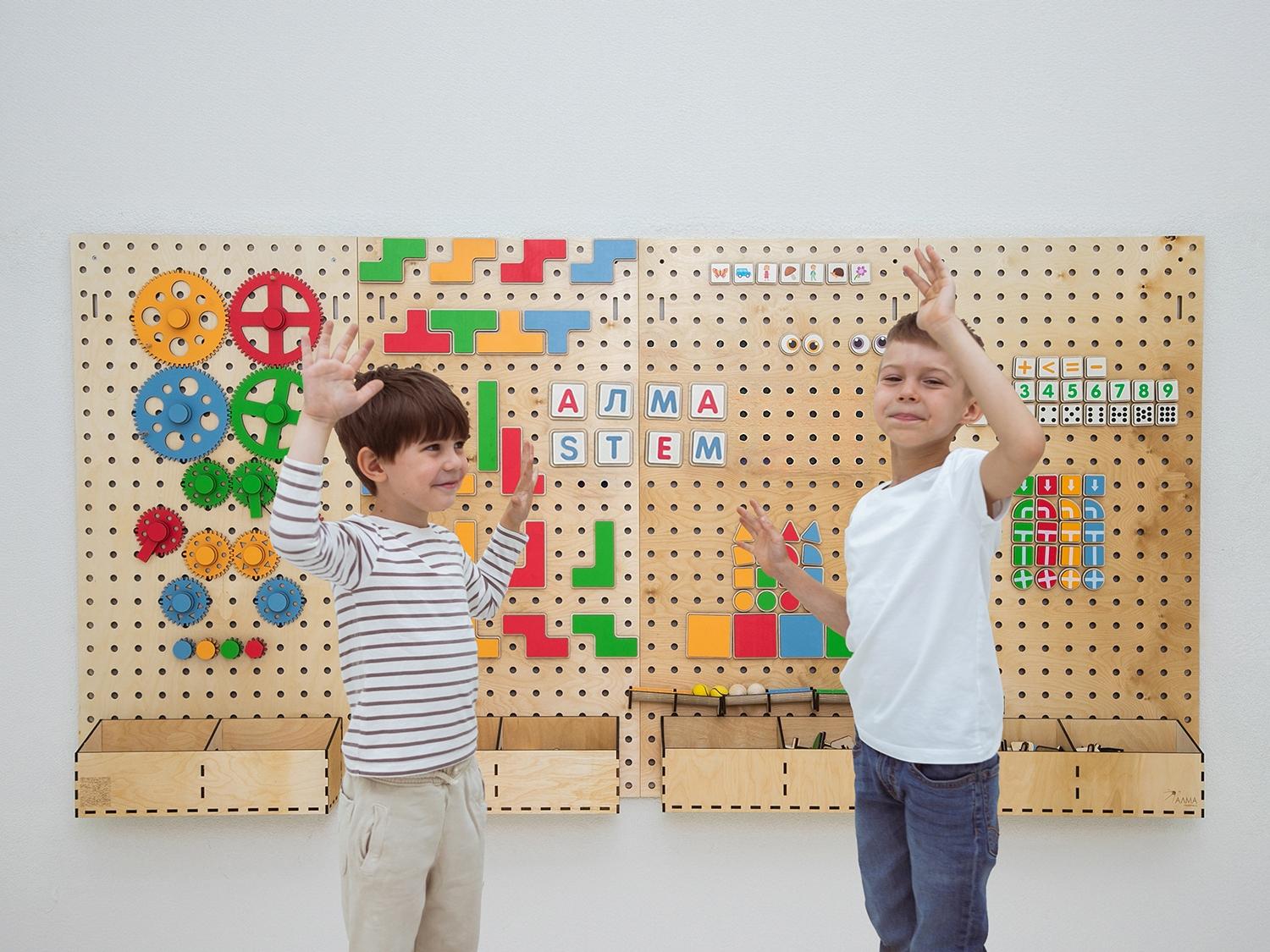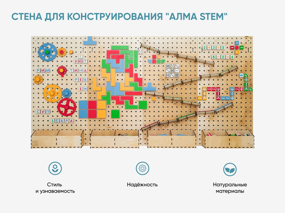 Настенный «АЛМА STEM» - это деревянный настенный конструктор с разнообразными подвижными элементами, разработанный с учетом принципов STEM образования: