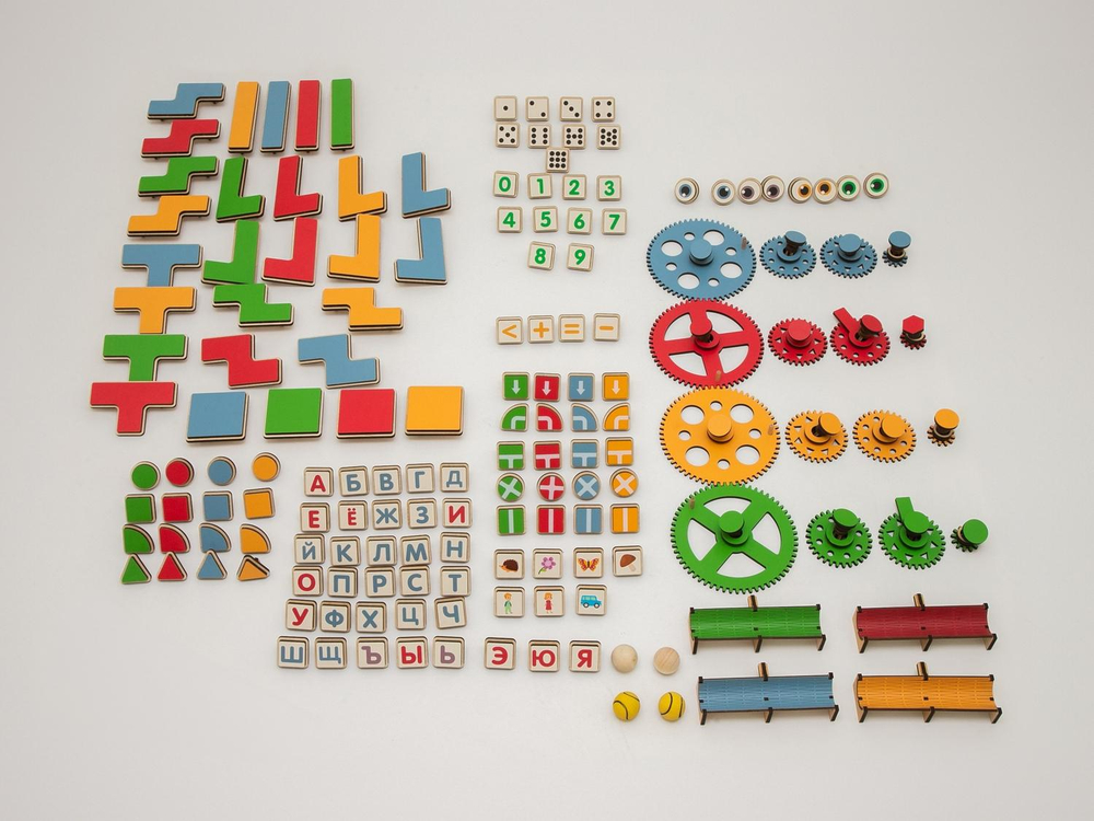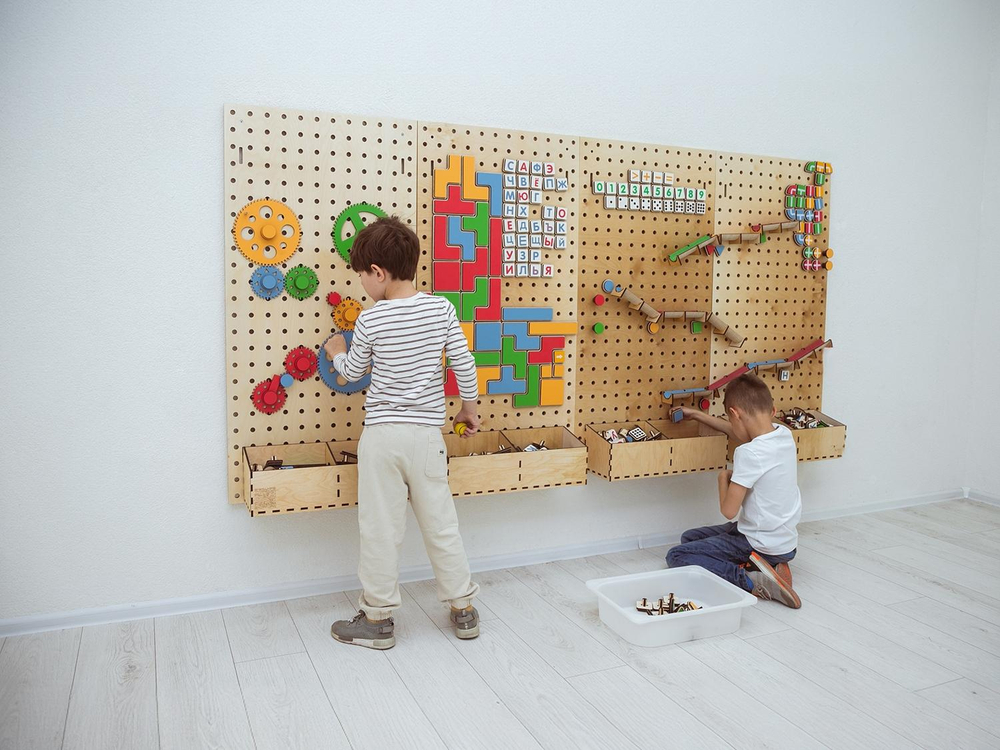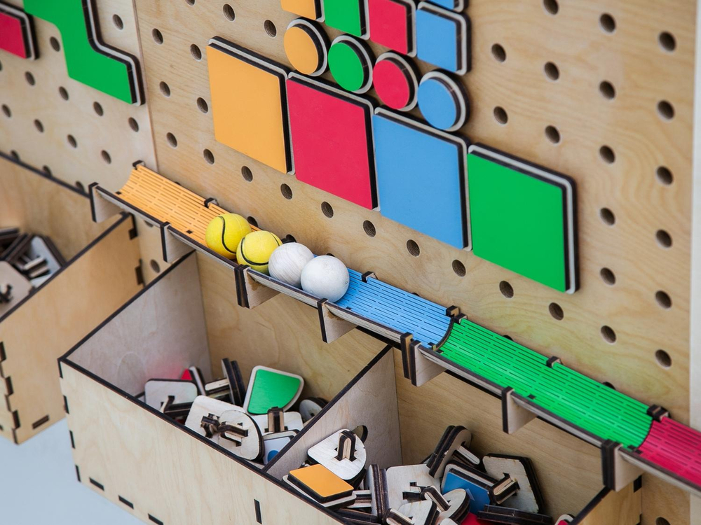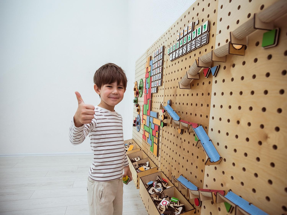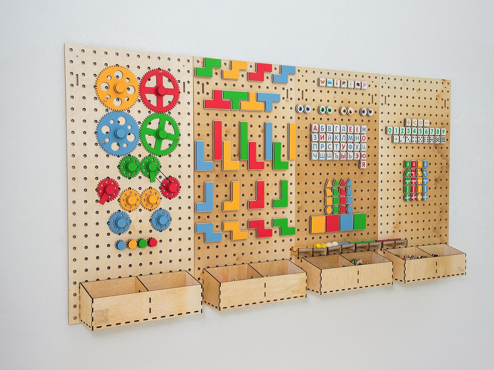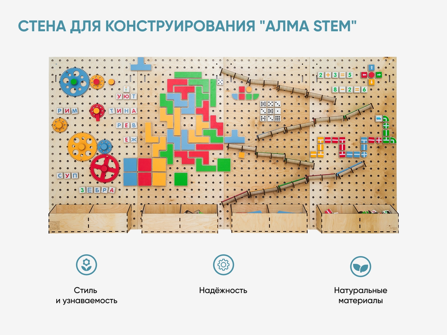 Настенный «АЛМА STEM» - это деревянный настенный конструктор с разнообразными подвижными элементами, разработанный с учетом принципов STEM образования: