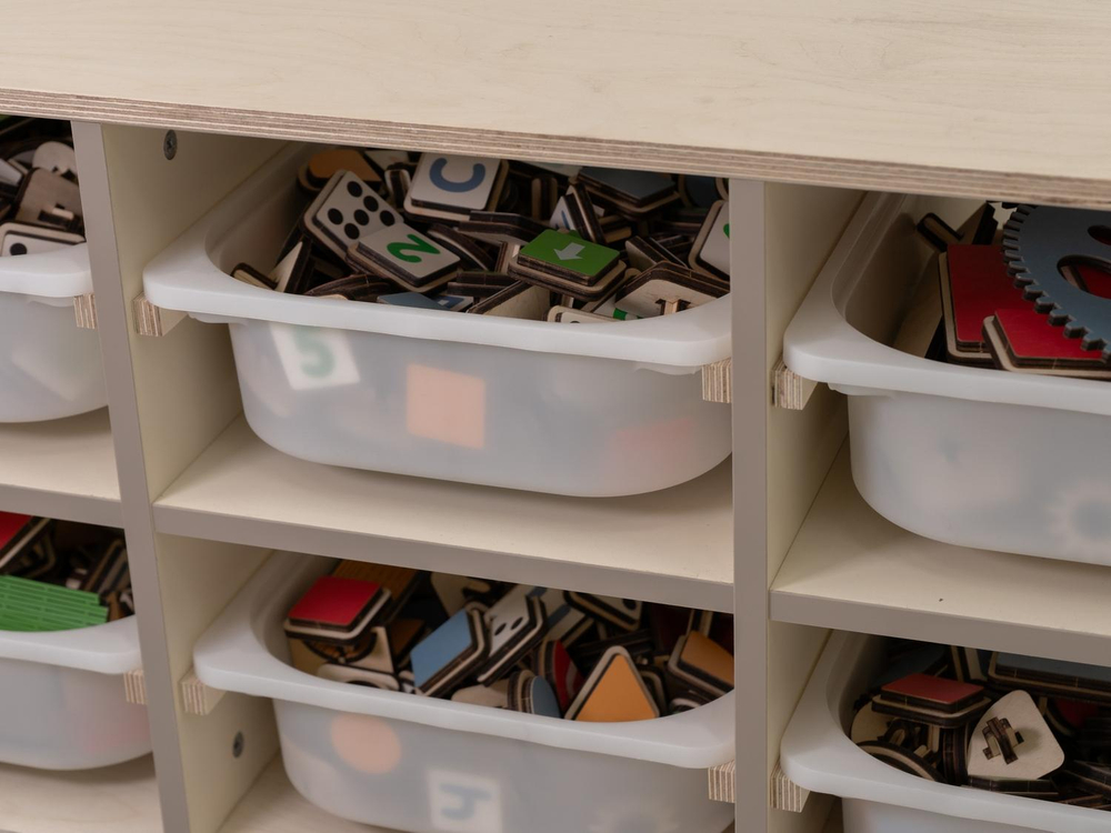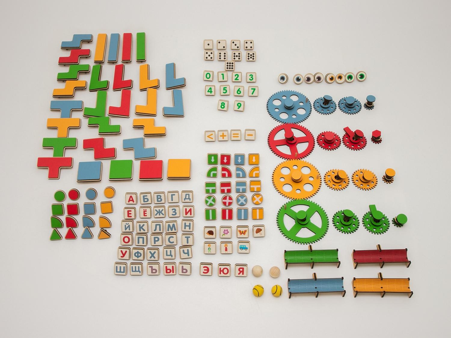 Панель «АЛМА STEM» от компании «АЛМА» состоит из фирменных деревянных платформ-оснований и цветных дидактических элементов для конструирования и моделирования. В процессе занятий их можно комбинировать, двигать и переставлять так, как этого требуется исходная задача. Предусмотрена сиSTEMа для хранения всех элементов конструктора.