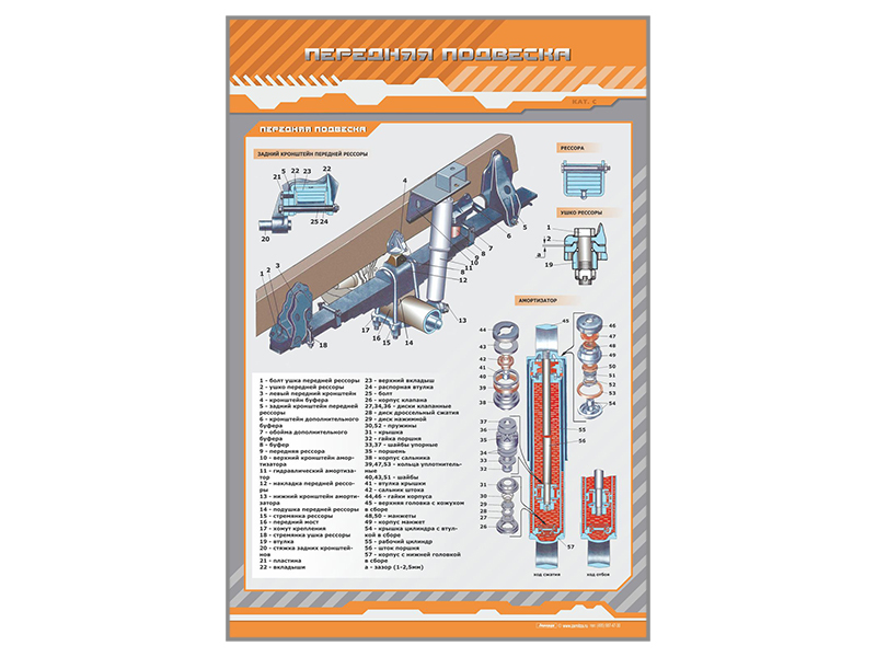 Стенд представляет собой информационную панель, на которой размещены сведения о передней подвеске транспортных средств.